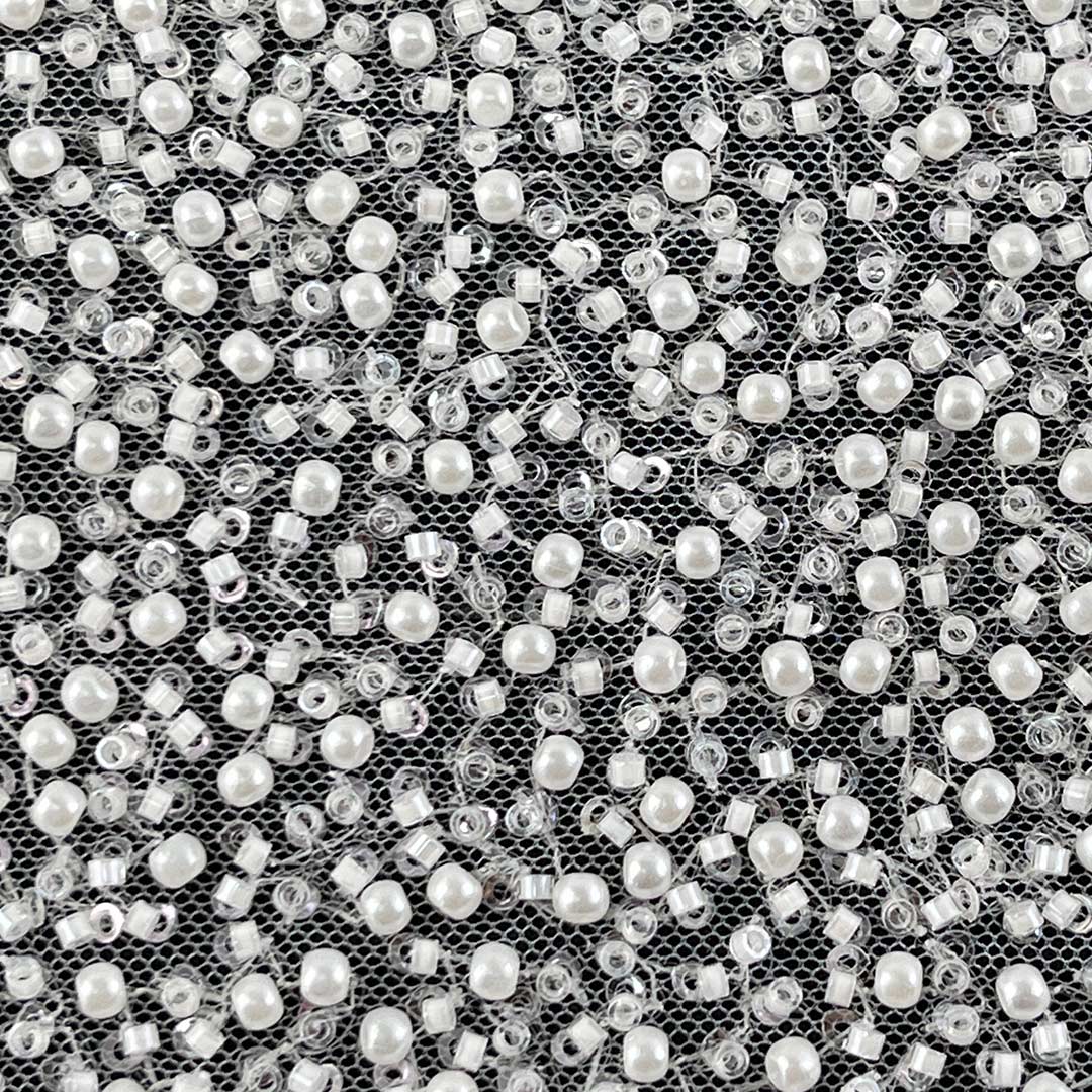 Introducing our dazzling matte faux pearl beaded fabric, expertly crafted from 100% Polyester. This luxurious fabric combines intricate beadwork with a glossy, shiny surface to create a material that radiates opulence and sophistication. The all-polyester base ensures exceptional durability, vibrant color retention, and resistance to wrinkles, while the meticulously applied beads add dimension, texture, and a captivating sparkle. This fabric boasts a structured yet fluid drape, perfectly suited for elegant dresses and stunning evening gowns that command attention at formal events.