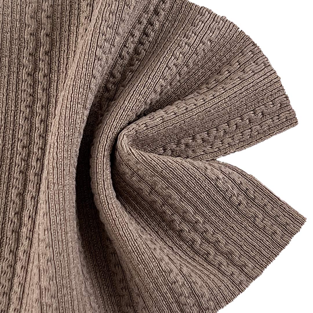 Whether designing cozy cardigans for layered looks or elegant dresses for special occasions, this Cable Jacquard Fabric empowers you to create garments that seamlessly blend artisanal craftsmanship with everyday wearability.