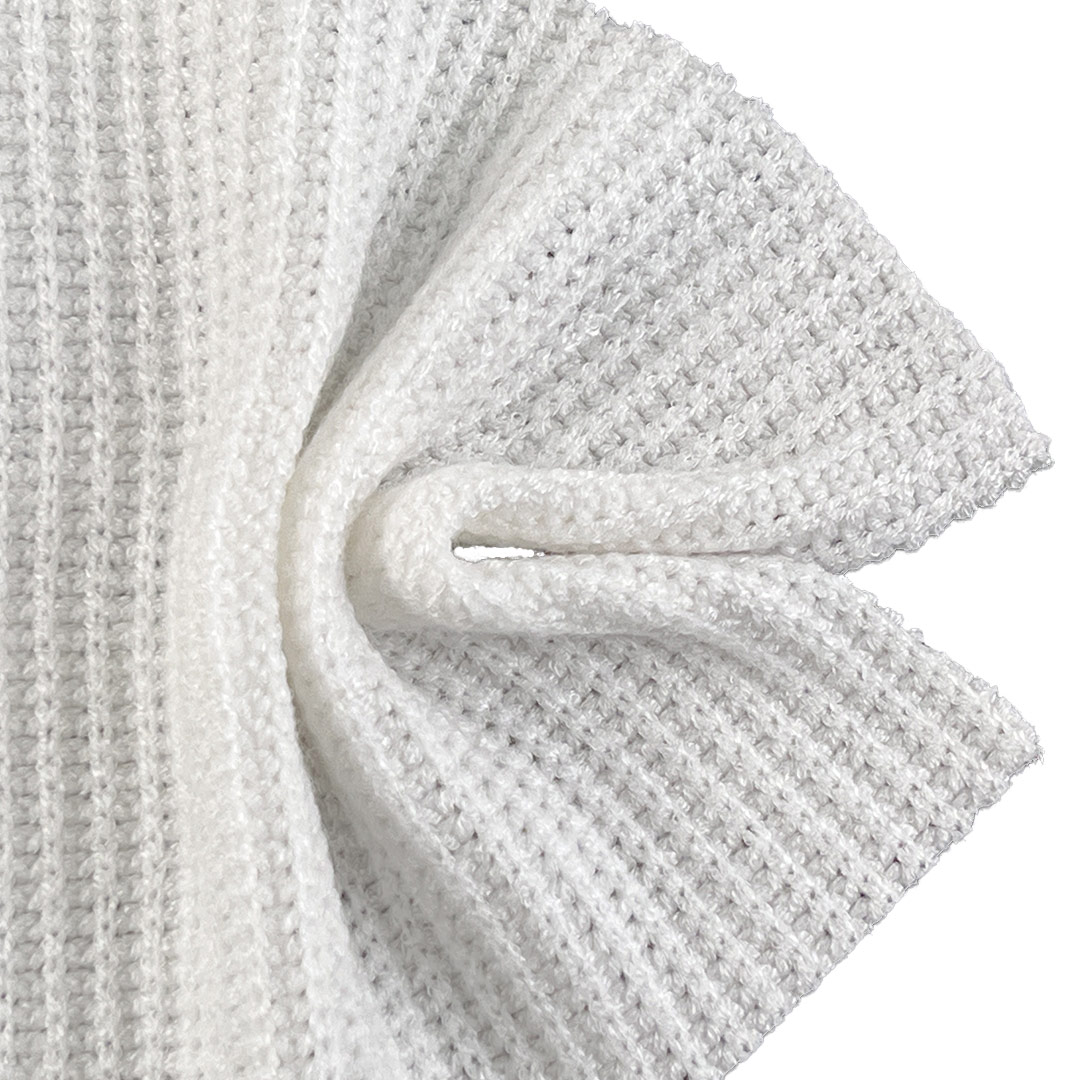 Polyester provides strength, colorfastness, and wrinkle resistance, while the 6% Spandex delivers smooth stretch and reliable recovery for ease of movement and a contoured fit. Weighing 340gsm, this heavyweight fabric offers substantial warmth and structure, making it well-suited for cooler weather garments that demand both style and functionality. Its textured surface and breathable construction allow it to adapt to elegant dresses, layered cardigans, and cozy sweaters. The fabric maintains its cable and jacquard definition, resists pilling, and offers consistent performance with proper care.