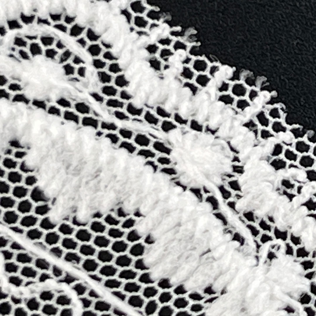 The transparent mesh construction ensures excellent airflow, making it ideal for layered designs or standalone pieces in warmer climates. Its delicate yet durable structure allows for beautiful drape and movement, enhancing the silhouette of any design. The intricate lace details create visual interest and texture, while the sheer quality adds a subtle allure to garments. Easy to work with and versatile in application, this fabric can be used as a primary material or as an elegant accent in apparel accessories.