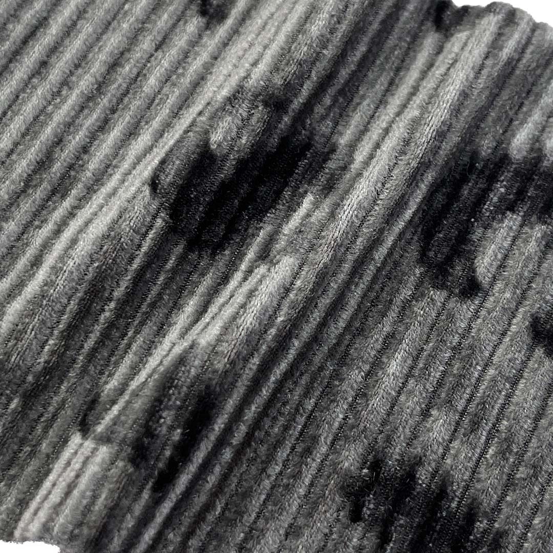 Polyester provides excellent durability and color retention, maintaining the fabric's refined appearance through extended wear. The strategic spandex content offers gentle elasticity and reliable recovery, allowing garments to move gracefully while retaining their structured silhouette. The combination of crushed velvet texture and plisse detailing creates exceptional visual depth and tactile richness, enhanced by the plush surface that adds luxurious softness and dimensional appeal. This fabric is ideal for creating evening dresses that demand both intricate visual drama and wearing comfort.