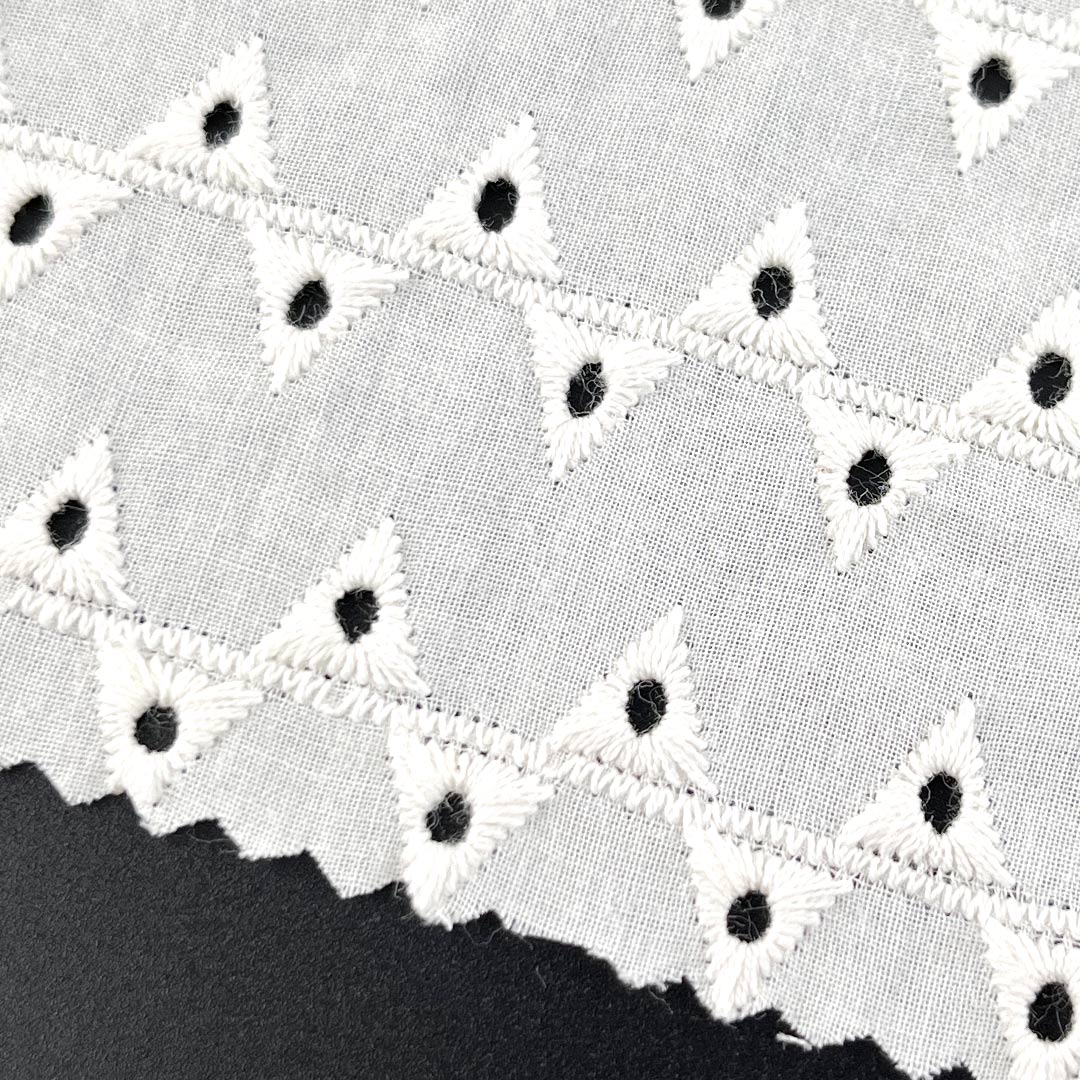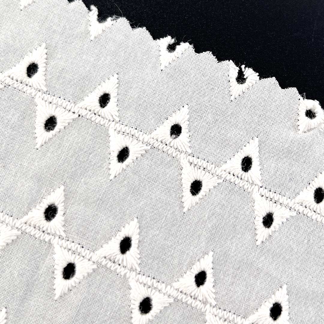 Crafted entirely from 100% premium cotton, this contemporary eyelet fabric showcases the structured artistry of geometric water-soluble embroidery fabric, featuring precise, clean-lined openwork patterns that create a modern textured aesthetic with exceptional breathability. The pure cotton composition ensures unparalleled softness, superior moisture-wicking performance, and gentle comfort against the skin, making it an ideal choice for sensitive wearers and extended daily use.