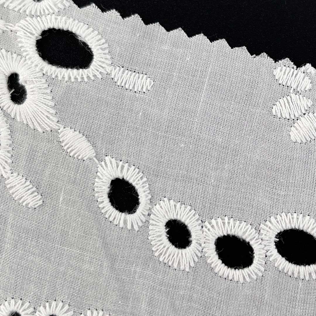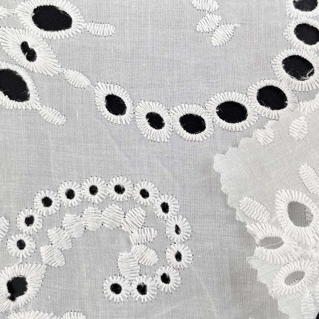 Crafted entirely from 100% premium cotton, this elegant eyelet fabric showcases the romantic artistry of high-end women‘s wear embroidery fabric, where delicate blossom and vine motifs are intricately etched into the fabric to create a breathable material with soft, organic texture and timeless feminine charm. The pure cotton composition ensures unparalleled softness, superior moisture-wicking performance, and gentle comfort against the skin, making it an ideal choice for sensitive wearers and extended daily use.