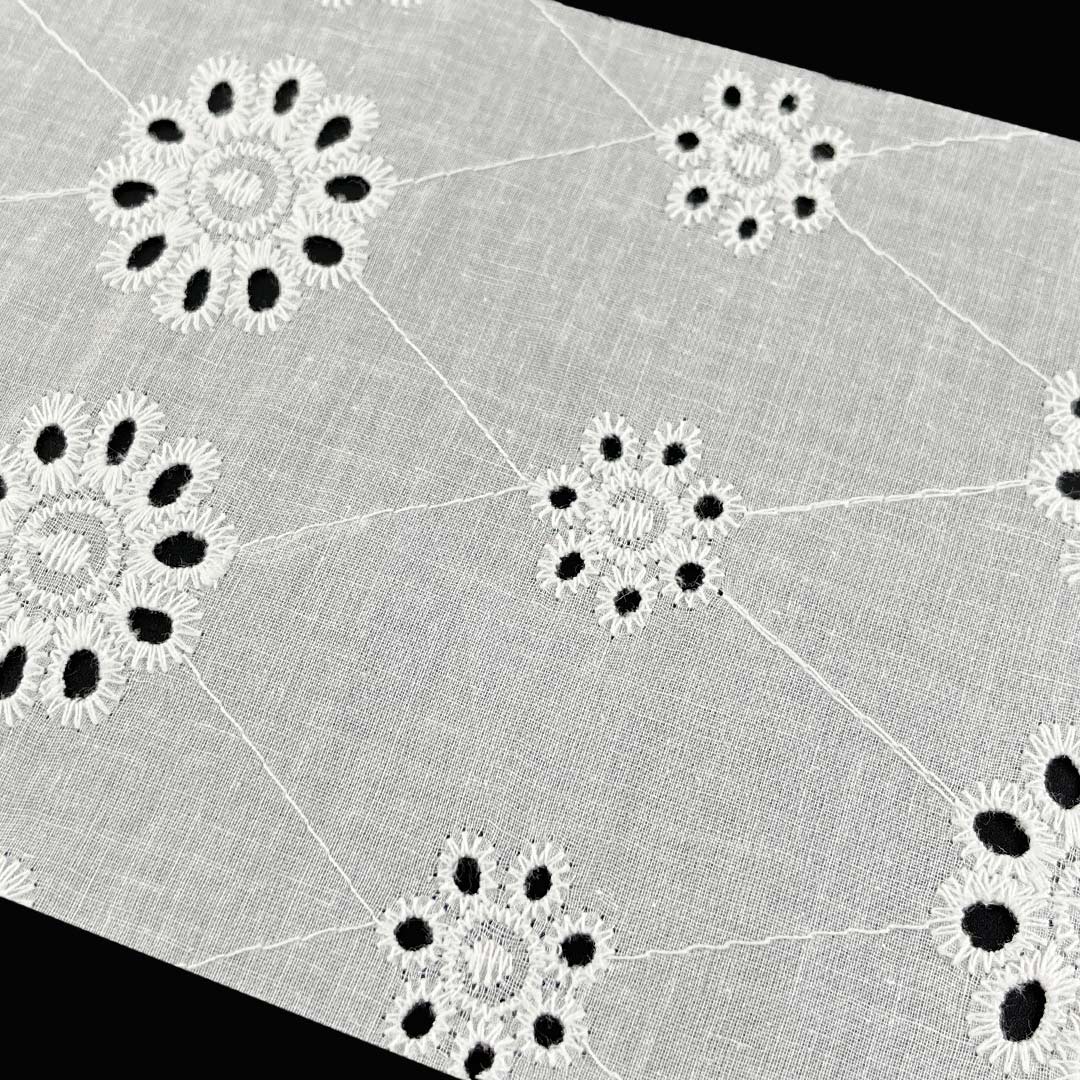 The intricate eyelet patterns provide a romantic, airy aesthetic while allowing optimal airflow, keeping you cool and comfortable in warm weather. Weighing light yet substantial enough to hold its shape, this fabric drapes beautifully and moves gracefully with the body. The clean-finished openings prevent fraying and maintain the fabric's structural integrity even after repeated wear and washing. Easy to care for and machine washable, this Eyelet Fabric retains its delicate embroidery details and fresh appearance over time.