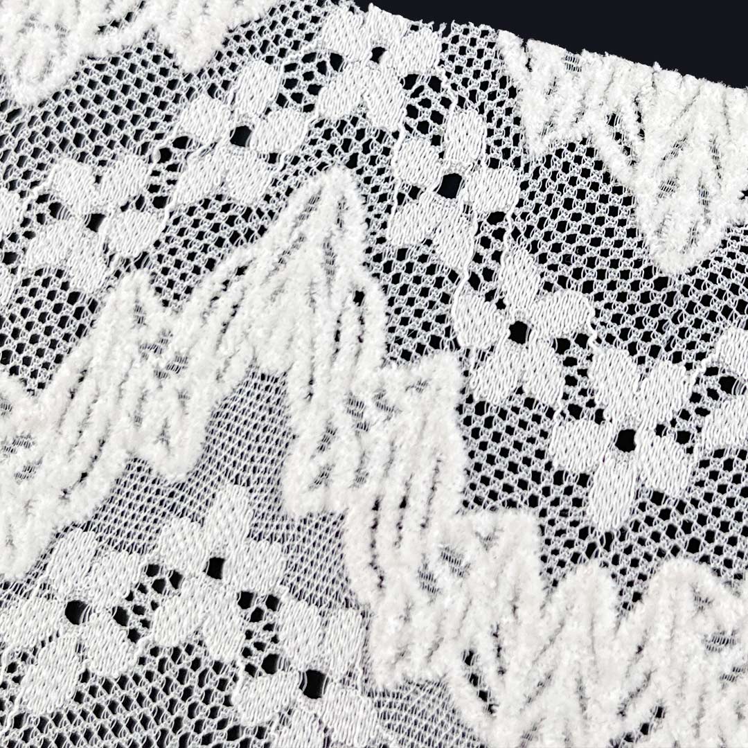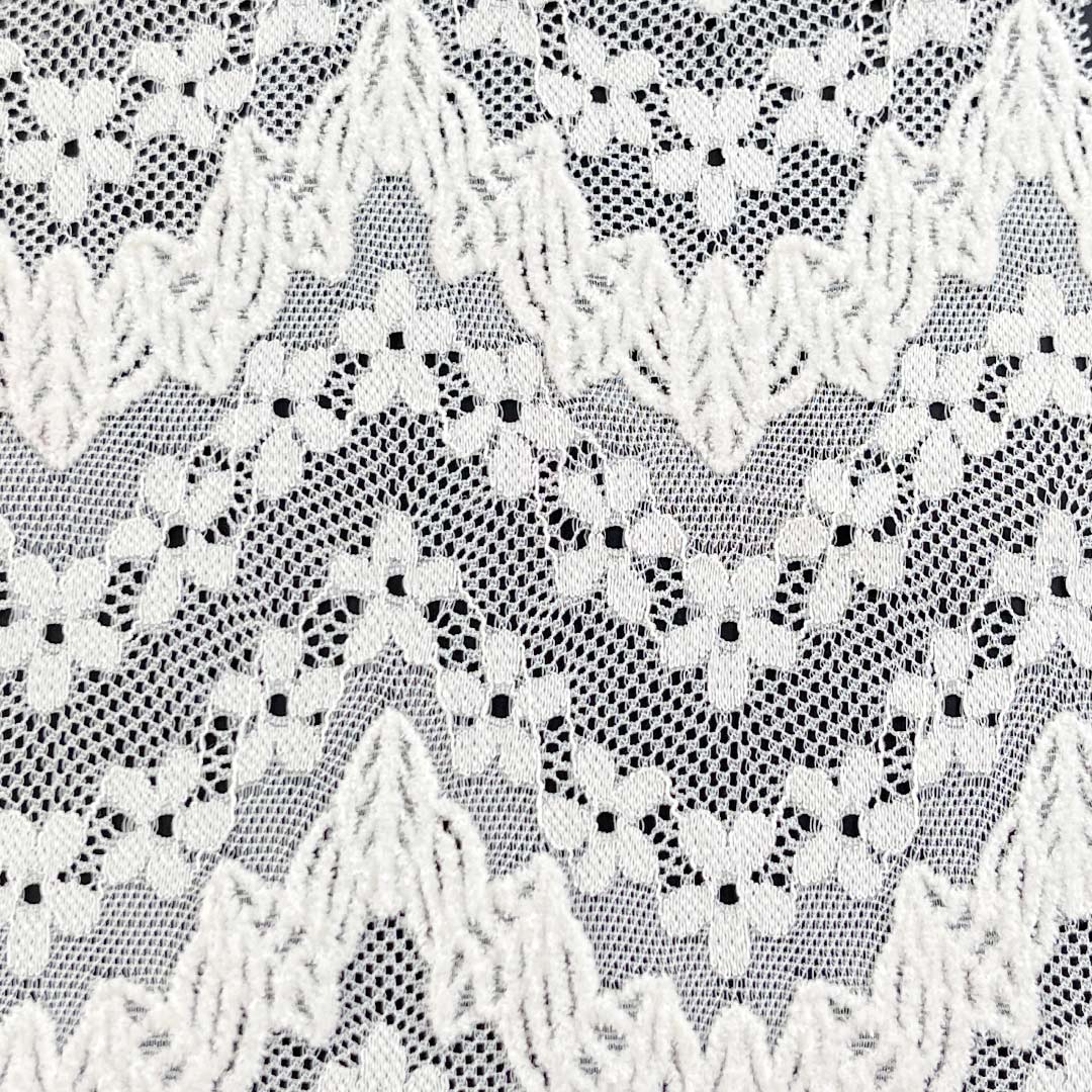 Polyester enhances color vibrancy, wrinkle resistance, and overall fabric stability, ensuring garments maintain a polished appearance over time. The 5% Spandex infusion offers excellent stretch and recovery, allowing the fabric to move gracefully with the body while maintaining its silhouette and structure. Featuring refined lace openwork with detailed designs, this fabric adds a touch of femininity, texture, and sophistication to both casual and semi-formal garments. Its breathable nature ensures comfort in various climates, allowing for airflow and ease of movement throughout the day. The fabric’s lightweight yet resilient construction supports a graceful drape and a flattering fit, whether used as an all-over material, a decorative overlay, or an accent trim.