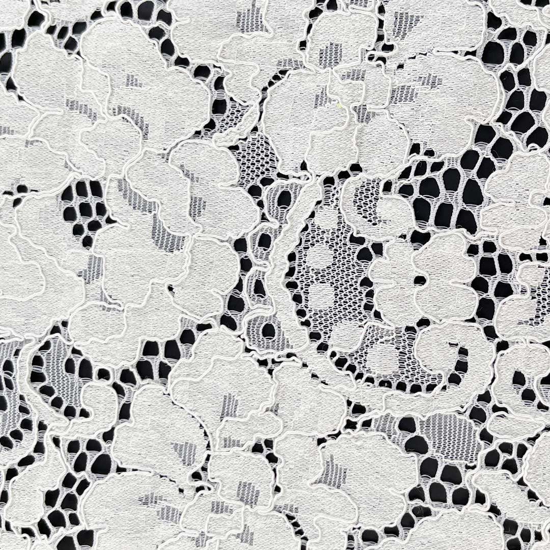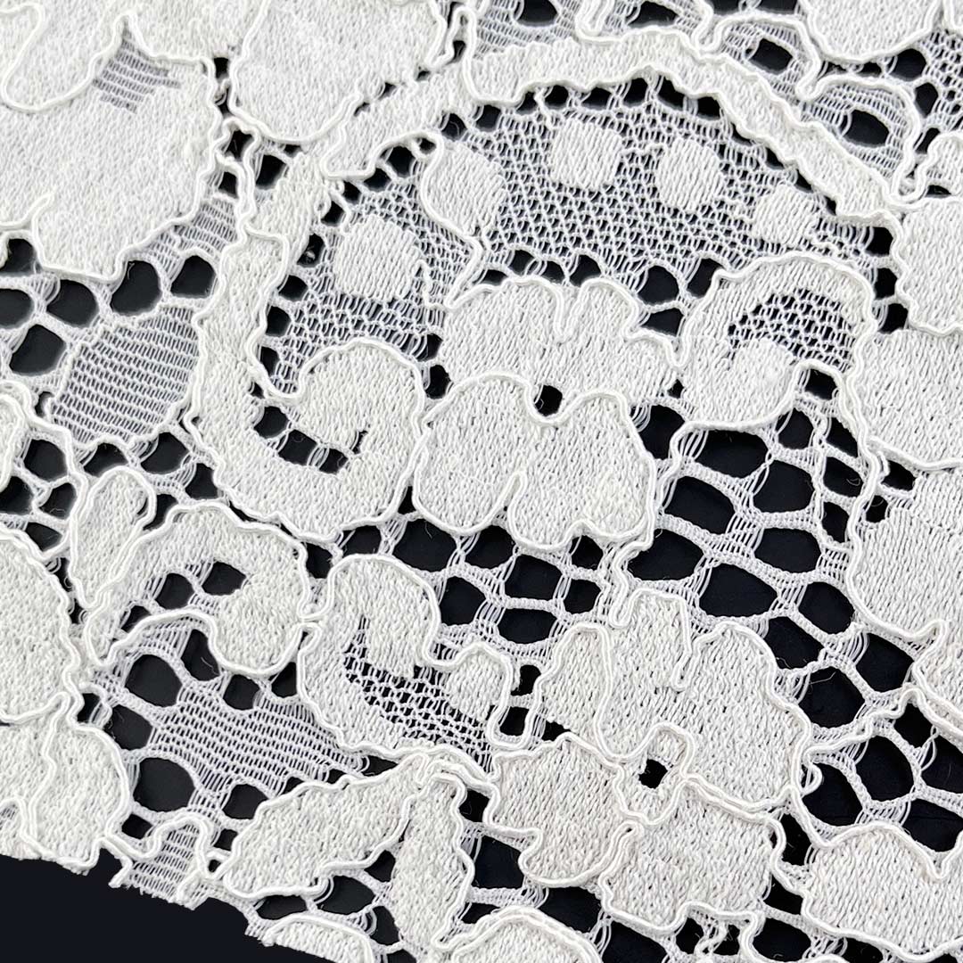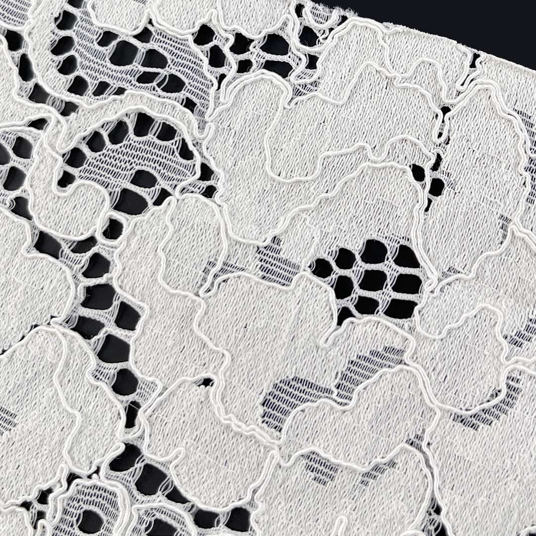 Nylon adds essential strength, elasticity, and shape retention, ensuring the delicate lace patterns maintain their intricate structure and the garment offers a supportive yet comfortable fit. Featuring refined lace openwork with detailed designs, this fabric adds a touch of femininity, texture, and sophistication to both casual and semi-formal garments. Its breathable nature ensures comfort in various climates, allowing for airflow and ease of movement throughout the day. The fabric’s lightweight yet resilient construction supports a graceful drape and a flattering silhouette, whether used as an all-over material, a decorative overlay, or an accent trim.