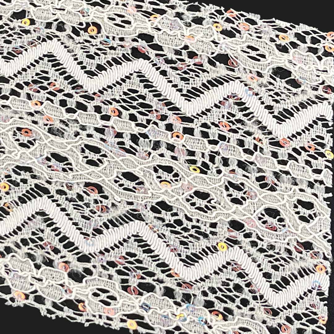 This soft & ltch-free sequin lace textile, composed of 90% polyester and 10% spandex, creates a sparkling and stretchable material specifically designed for evening gowns and bridal dresses. The high polyester content provides a durable, colorfast base that securely holds the sequins while offering excellent shape retention for formal silhouettes.
