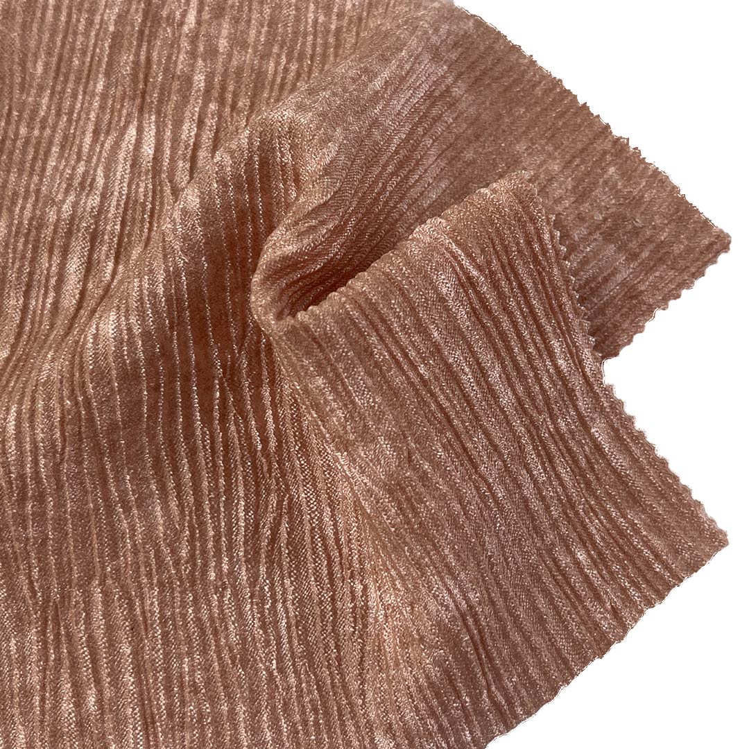 Weighing only 110gsm, this fabric offers a beautiful fluid drape that moves gracefully with the body, making it ideal for flowing designs and layered looks. The textured surface feels subtly crisp yet soft, creating an appealing tactile experience. The permanent pleats not only enhance the fabric's aesthetic appeal but also improve its flexibility and air circulation. Demonstrating good durability and easy care, this innovative textile maintains its pleated texture through repeated wear and washing.