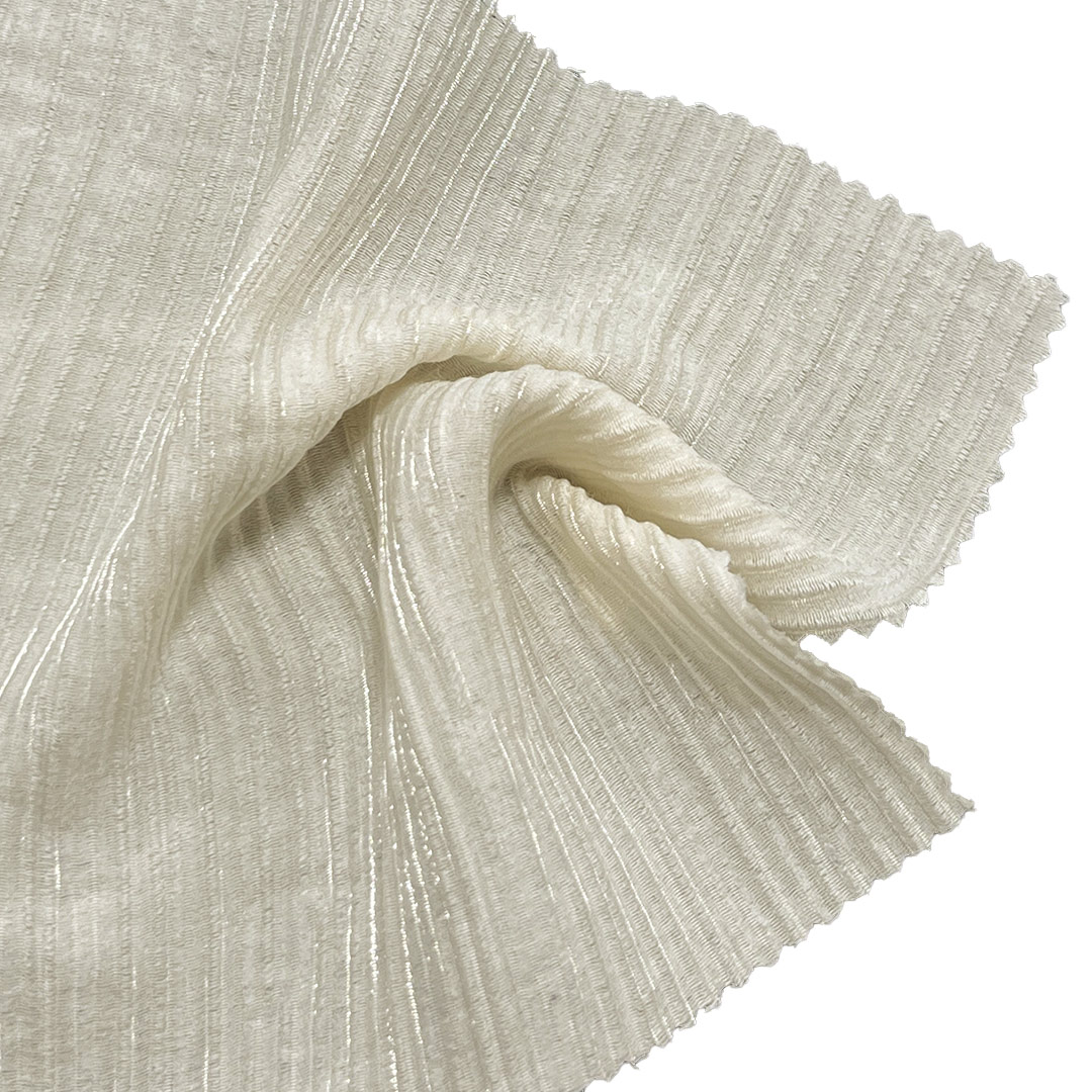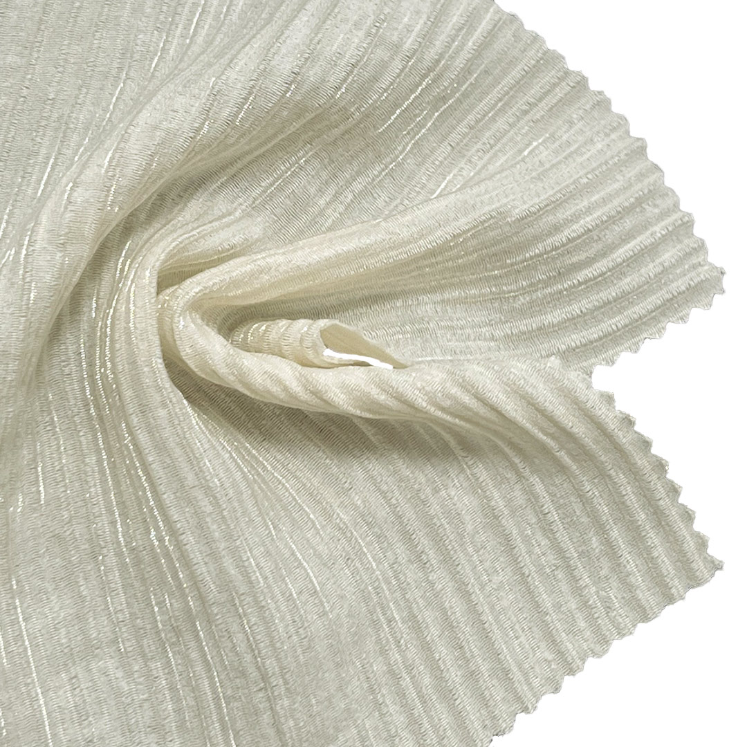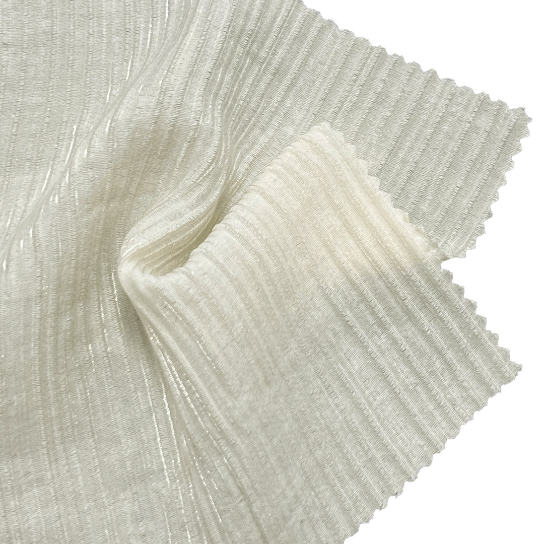 Introducing our distinctive Plisse Fabric, crafted from 71% Polyester, 6% Wool, and 23% Polyamide with a weight of 110gsm (3.9 oz) to deliver a uniquely textured material with a distinctive crinkled hand feel, perfect for creating fashionable T-shirts and stylish skirts. This innovative fabric features an intentionally permanent plissé (crinkled) texture that creates captivating visual depth and luxurious tactile interest, offering a modern, artistic aesthetic ideal for elevated casual and semi-formal designs.