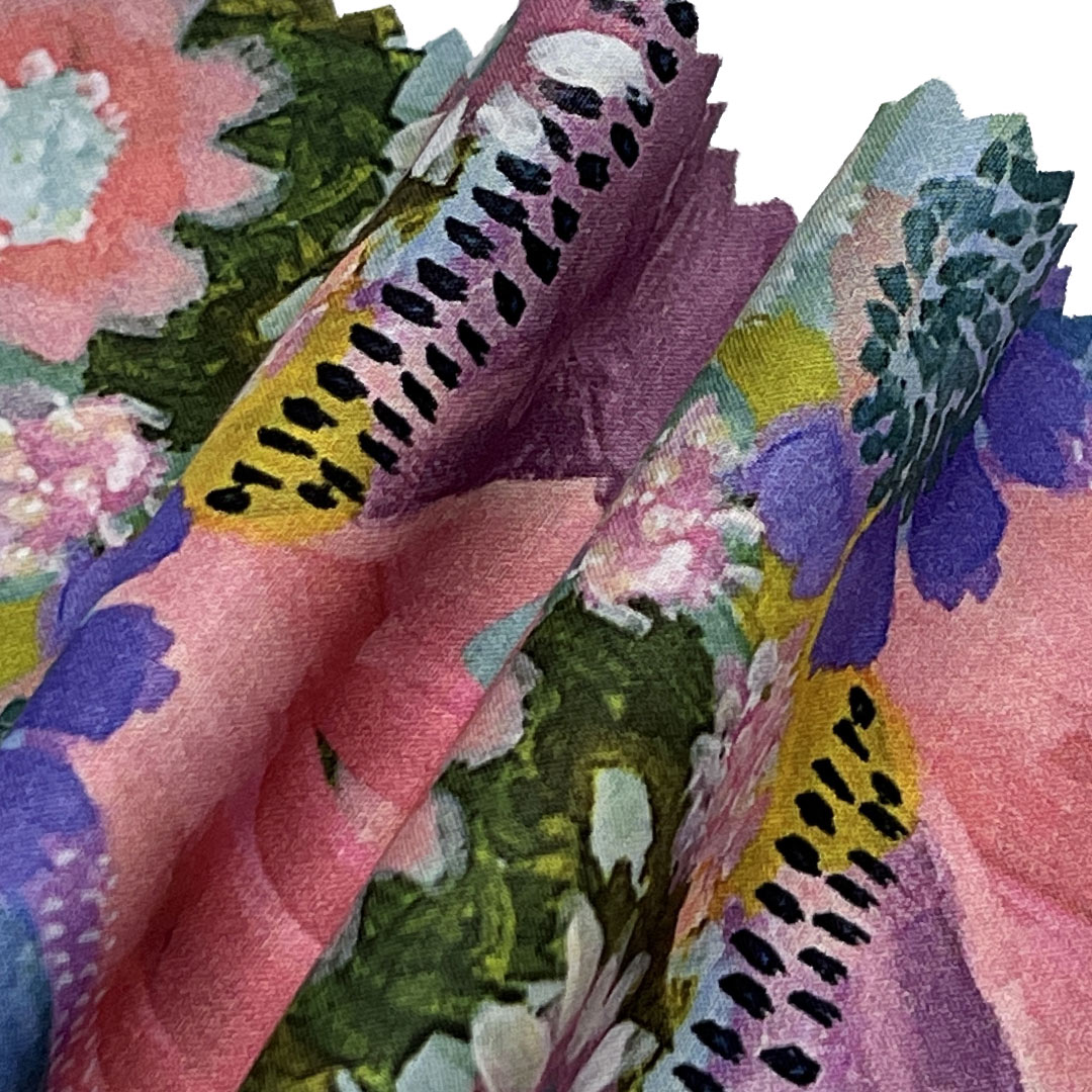 Its smooth, fine texture provides a soft hand feel while allowing lively prints to stand out with clarity and depth. Perfect for chic beach cover-ups and airy dresses, this patterned fabric moves with grace and offers versatile wearability for a variety of occasions. The printed motifs, from tropical florals and botanical designs to geometric and abstract art, infuse each garment with personality and summery charm.