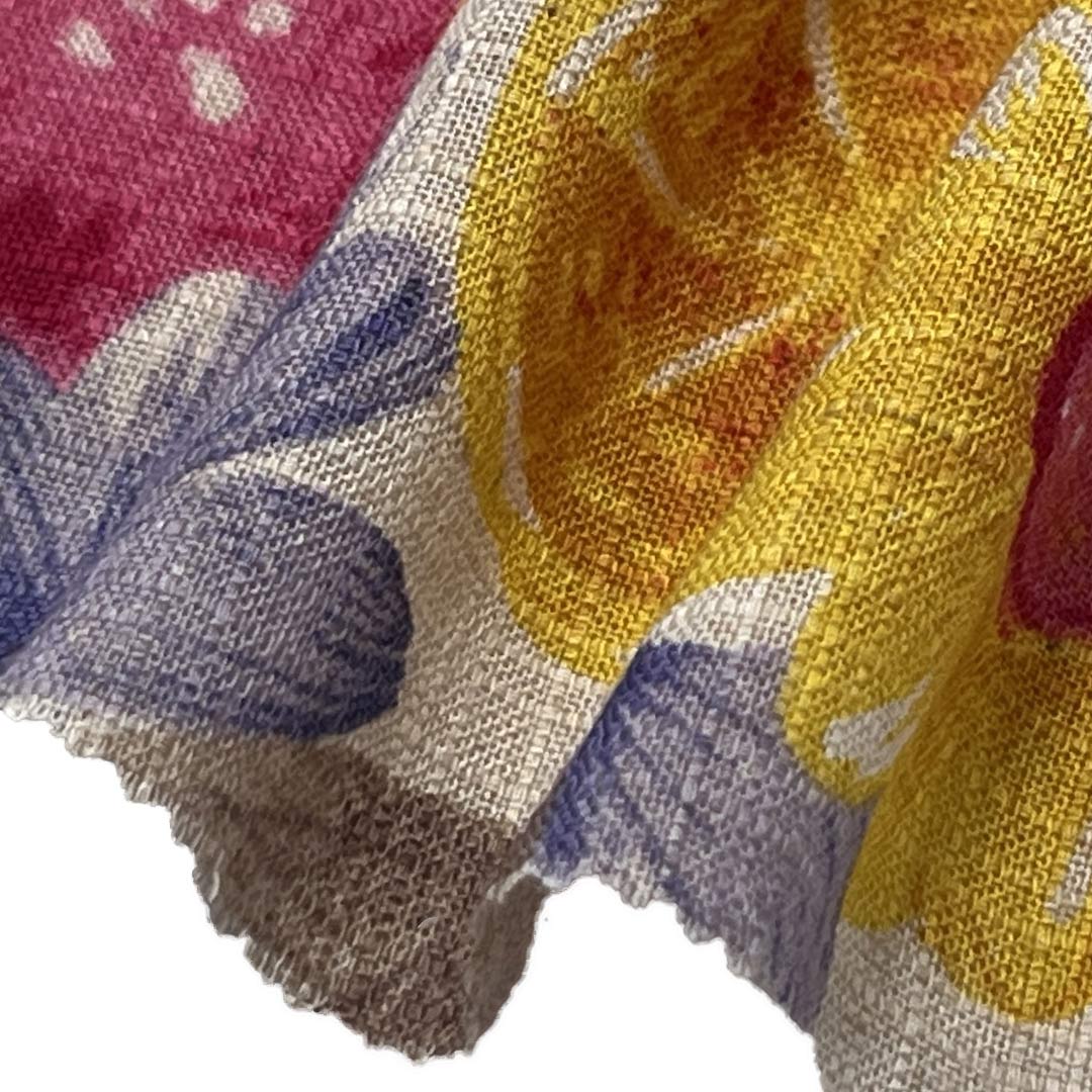Crafted from a unique blend of 70% Linen, 80% Polyester, and 13% Cotton, our printed textile offers a lightweight, breathable, and versatile material ideal for creating flowy dresses, stylish shirts, and fashionable beachwear. This innovative fabric combines the rustic texture and natural breathability of linen with the durability and quick-drying capability of polyester, while the cotton adds a touch of softness and comfort.