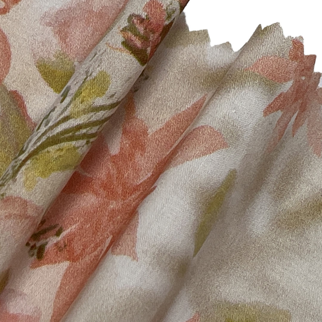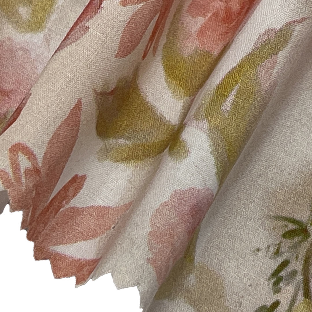 Weighing just 95gsm, this fabric drapes gracefully and feels soft against the skin, providing ease of movement and a flattering fit for stylish beach cover-ups and flowing dresses. The printed designs are carefully applied to preserve the fabric's natural texture and flexibility, allowing it to adapt beautifully to the body's contours. Perfect for creating chic beachwear for seaside escapes or elegant dresses for summer occasions, this fabric blends visual appeal with everyday comfort.