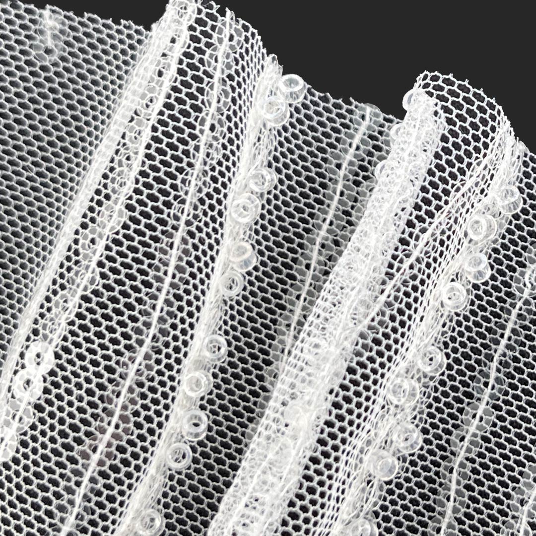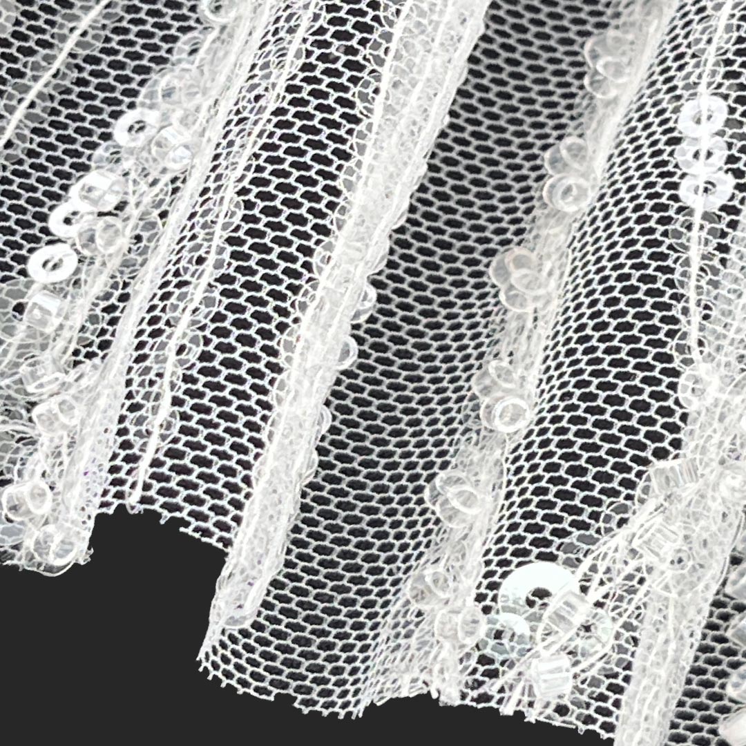 The glossy finish enhances the fabric's reflective quality, catching light with every movement to create a dynamic, celebratory effect. The shiny surface and beaded details work harmoniously to deliver a lavish tactile and visual experience, ideal for special occasions where style and glamour take center stage. Easy to care for with gentle handling, this Beaded Fabric retains its dazzling appearance, secure bead adhesion, and sophisticated allure over time.