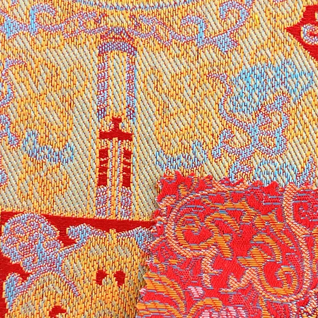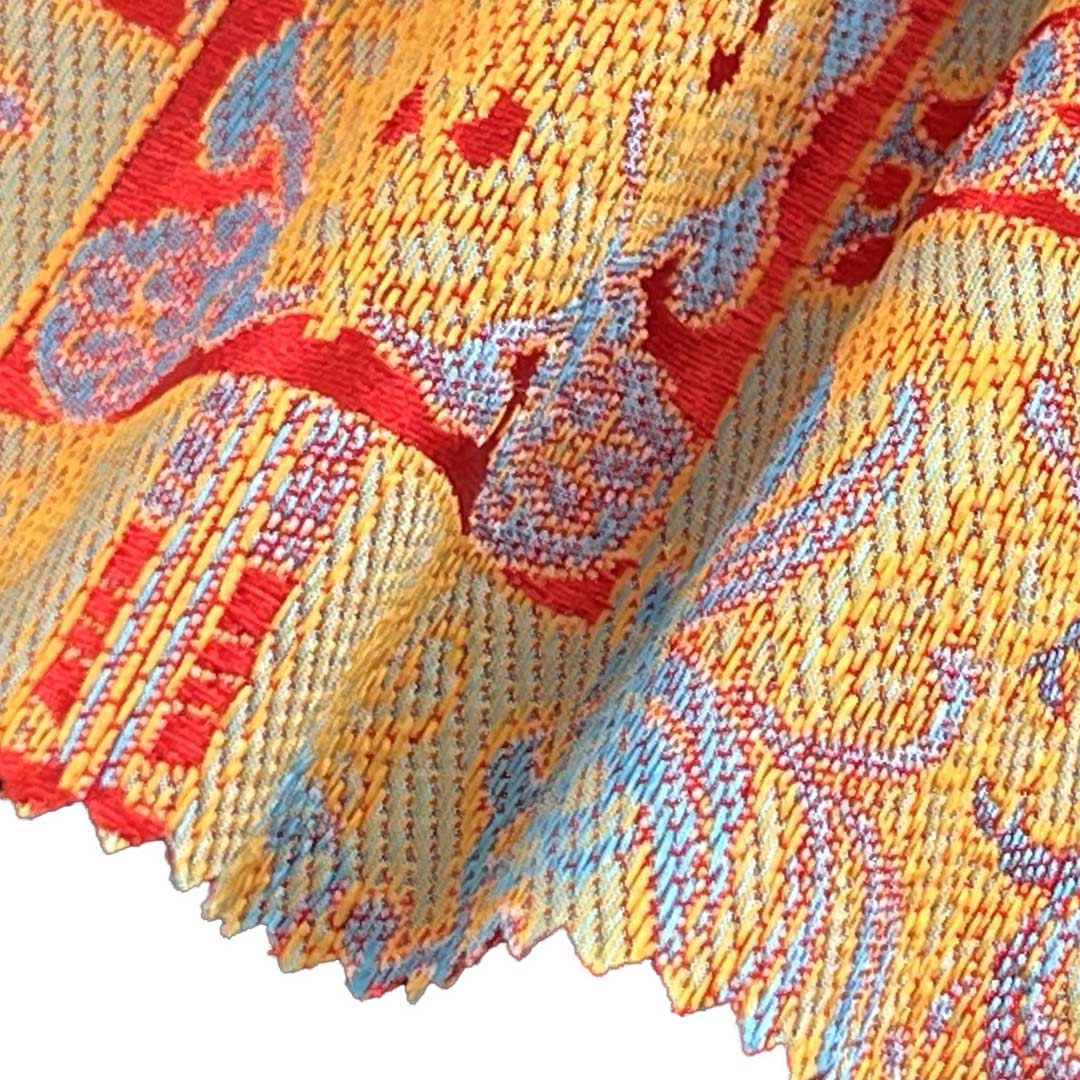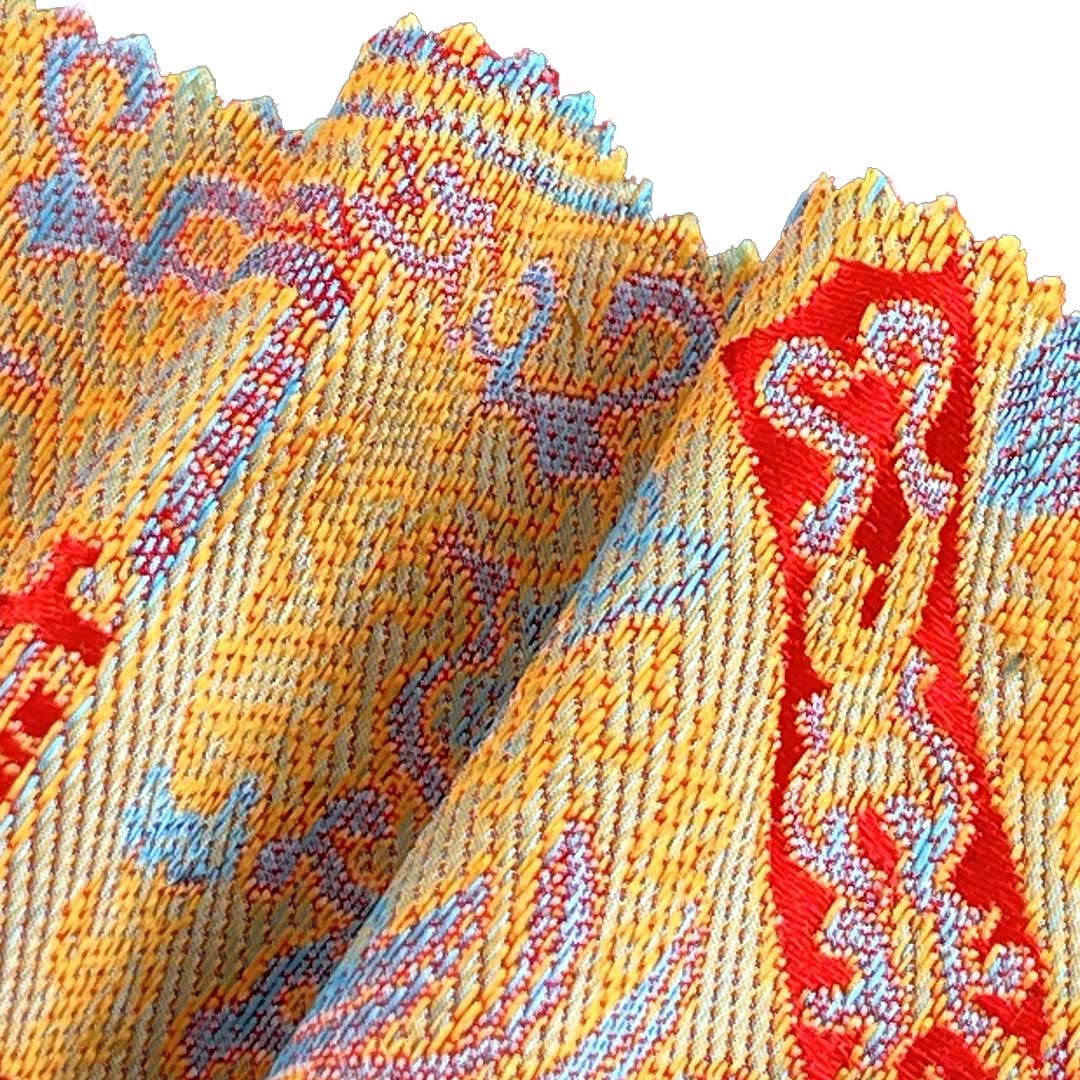 Introducing our elegant jacquard brocade material, expertly crafted from 100% Polyester. This refined fabric combines the intricate, raised patterns of traditional brocade weaving with a modern ripstop construction, creating a material that offers both decorative sophistication and exceptional durability. The all-polyester composition ensures superior strength, vibrant color retention, shape stability, and resistance to wrinkles and tearing, making it an ideal choice for luxurious home textiles. This fabric boasts a crisp hand feel and a structured drape, perfectly suited for decorative table runners that elevate dining settings and elegant curtains that frame interior spaces with timeless style.