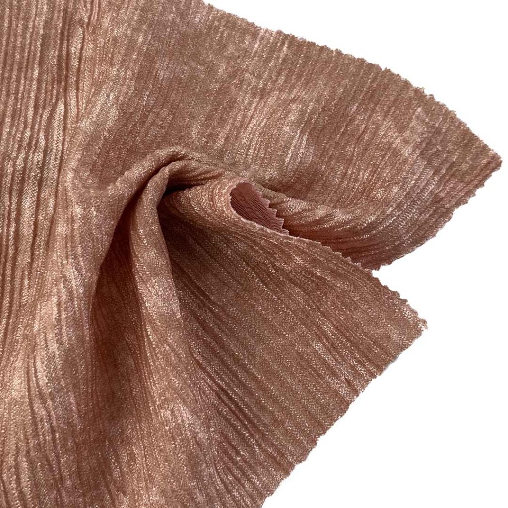 Weighing only 110gsm, this fabric offers a beautiful fluid drape that moves gracefully with the body, making it ideal for flowing designs and layered looks. The textured surface feels subtly crisp yet soft, creating an appealing tactile experience. The permanent pleats not only enhance the fabric's aesthetic appeal but also improve its flexibility and air circulation. Demonstrating good durability and easy care, this innovative textile maintains its pleated texture through repeated wear and washing.