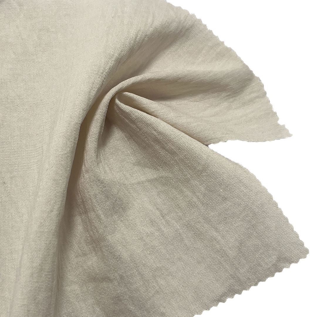 Experience the exquisite blend of natural elegance and contemporary performance with our 130gsm dress crepe fabric, expertly crafted from 15% Nylon, 70% Tencel, and 15% Linen. This medium-weight fabric showcases the distinctive crinkled texture of crepe, enhanced by a subtle translucency that adds depth, movement, and a touch of ethereal beauty to any design. The crepe weave produces a finely textured surface with an elegant irregular crinkle, while Tencel provides exceptional breathability, moisture-wicking properties, and a fluid, graceful drape. Nylon adds strength, durability, and a smooth hand feel, and linen contributes a natural fibrous texture, crispness, and breathable comfort.