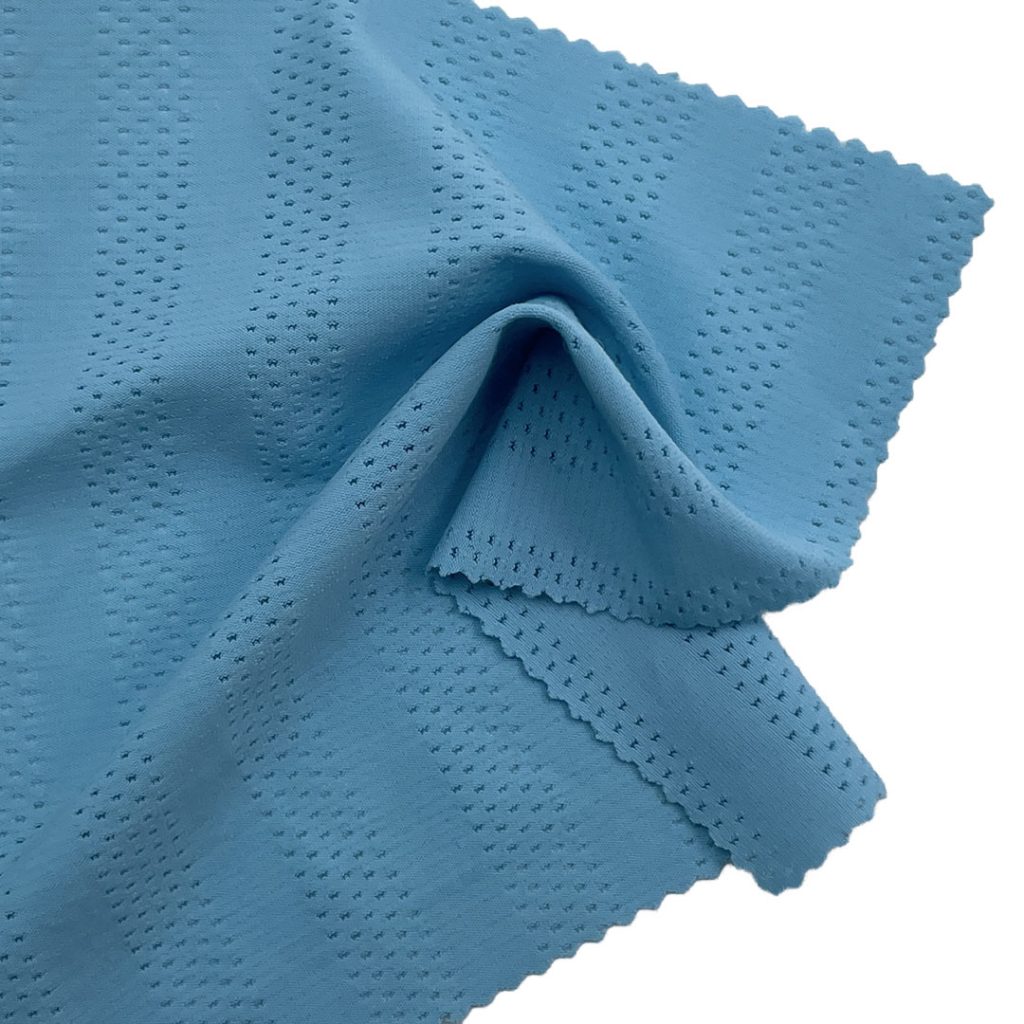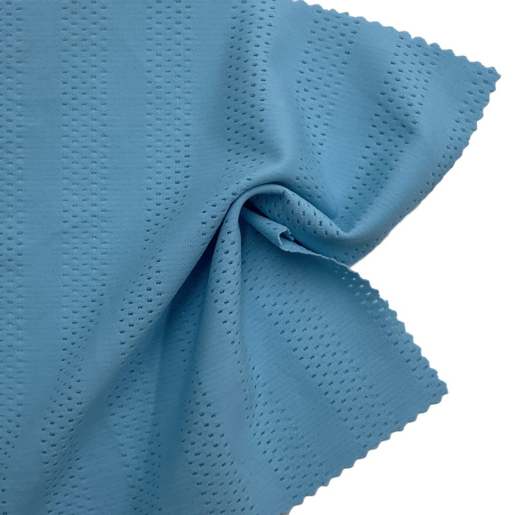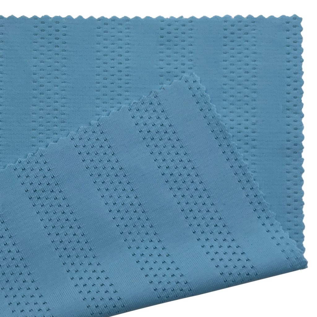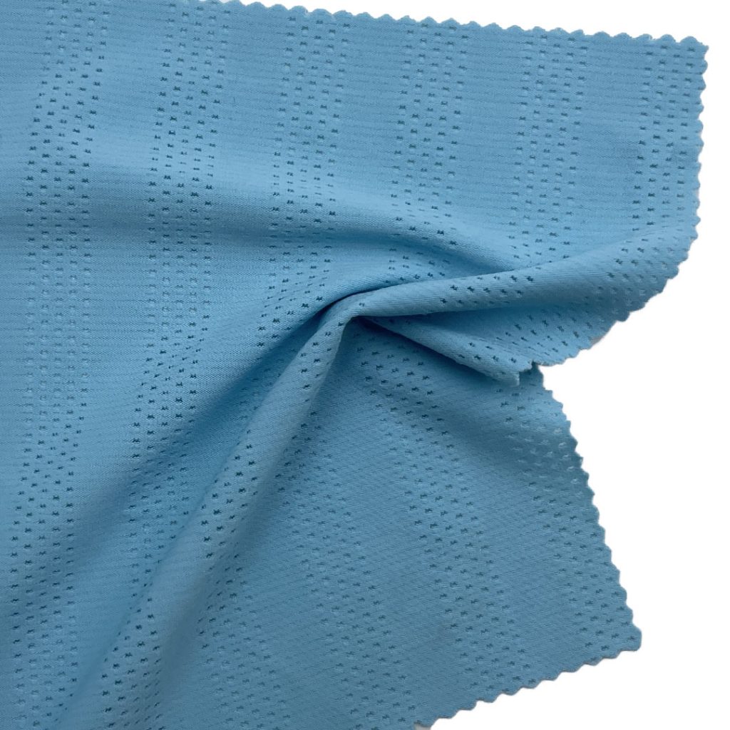 This 170gsm fabric innovatively combines Mesh, Nylon, and Jacquard constructions with a blend of 85% Polyester and 15% Spandex to create a high-performance material that is smooth to the touch and features 4-way stretch for exceptional mobility and comfort. This unique combination makes it ideally suited for a diverse range of garments including swimwear, T-shirts, sportswear, and polo tops. The Mesh structure, characterized by its open spaces, ensures outstanding breathability and allows air to circulate effectively, which is crucial for sportswear and active T-shirts to keep the wearer cool and dry. Simultaneously, the Jacquard technique introduces intricate, raised patterns into the fabric, adding visual depth and a luxurious, textured effect to polo tops and swimwear, enhancing their aesthetic appeal. The high Polyester content ensures excellent durability, color retention, and quick-drying properties, which are essential for swimwear exposed to water and chlorine, as well as for sportswear that undergoes frequent washing and intense activity. The significant percentage of Spandex (15%) is the key component providing the generous 4-way stretch, allowing the fabric to stretch and recover in all directions. This guarantees a comfortable, flattering fit and unparalleled freedom of movement in everything from form-fitting swimwear to dynamic sportswear and comfortable T-shirts. Weighing 170gsm (5.0 oz), this lightweight fabric offers excellent breathability and ease of movement, making it an ideal choice for high-intensity activities and layered outfits. The fabric's smooth texture feels gentle against the skin, reducing friction and enhancing comfort for all-day wear in T-shirts or during physical activity in sportswear. Easy to care for and designed to withstand repeated washing and active use, this fabric resists pilling and maintains its smooth texture, structural integrity, and vibrant colors over time. This Mesh, Nylon, and Jacquard fabric is the perfect choice for designers and brands aiming to create high-quality, comfortable, and stylish apparel that successfully merges aesthetic appeal with the high-performance demands of flexibility, breathability, and comfort for modern, active lifestyles.