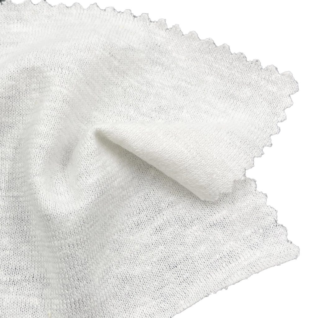Crafted from a distinctive blend of 55% Linen and 45% Cotton, this 175gsm single jersey fabric showcases a unique coarse textured hand feel that brings natural character and artisanal appeal to garments. The linen content provides excellent breathability and a rustic texture, while cotton ensures softness and durability against the skin. Weighing 175gsm, this medium-weight fabric offers substantial coverage while maintaining excellent airflow, making it ideal for warm-weather T-shirts and dresses.