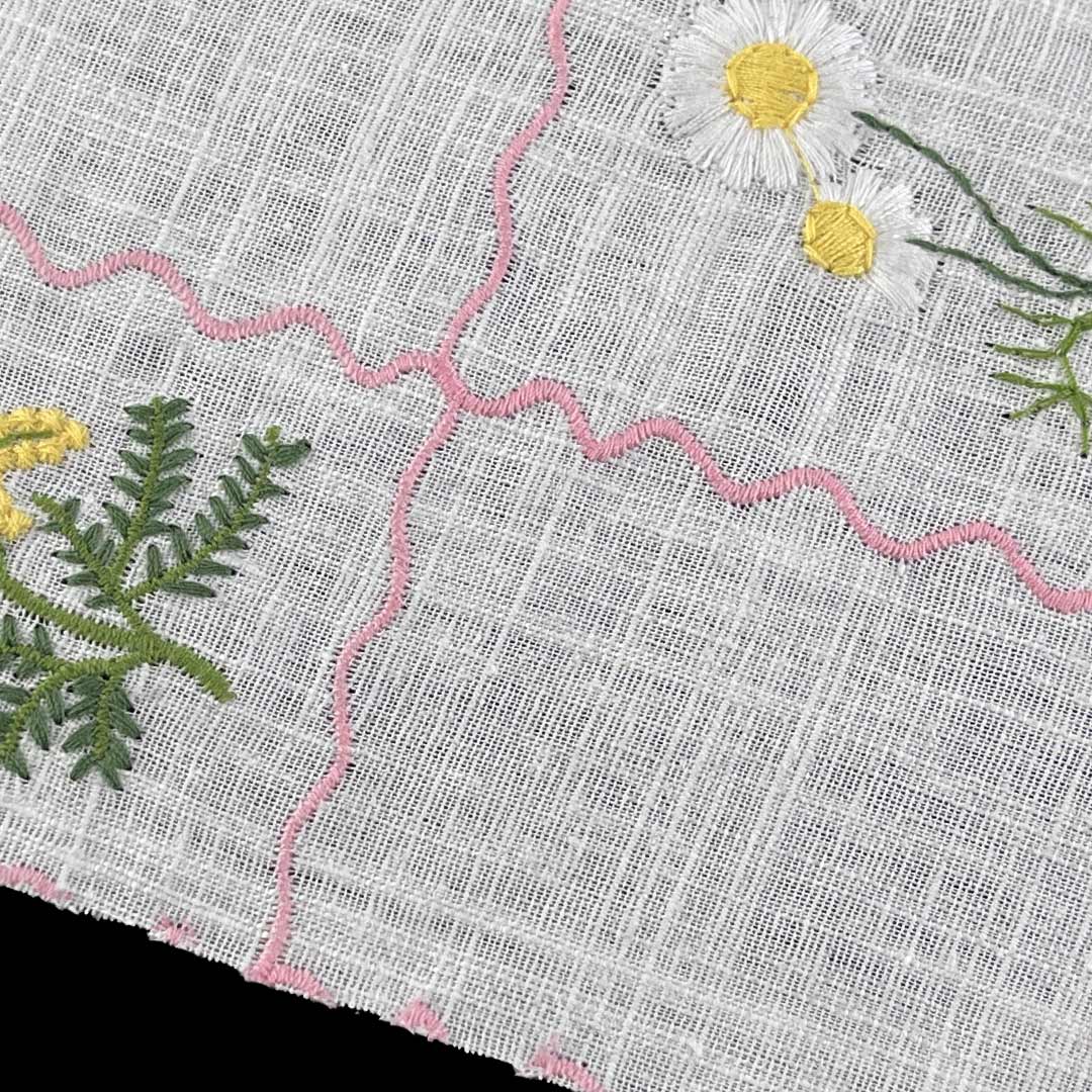 The embroidered motifs are carefully stitched to enhance the fabric's texture, providing a sophisticated, dimensional effect that catches the light and draws the eye. With a structured yet flexible drape, this fabric lays beautifully on surfaces and moves gracefully in garments, perfect for creating elegant bed runners for luxurious interiors and stylish jackets for everyday wear. The textured embroidery not only elevates the aesthetic appeal but also adds a layer of luxury and craftsmanship to each piece. Easy to care for and machine washable, this fabric maintains its intricate details, vibrant colors, and refined appearance over time.