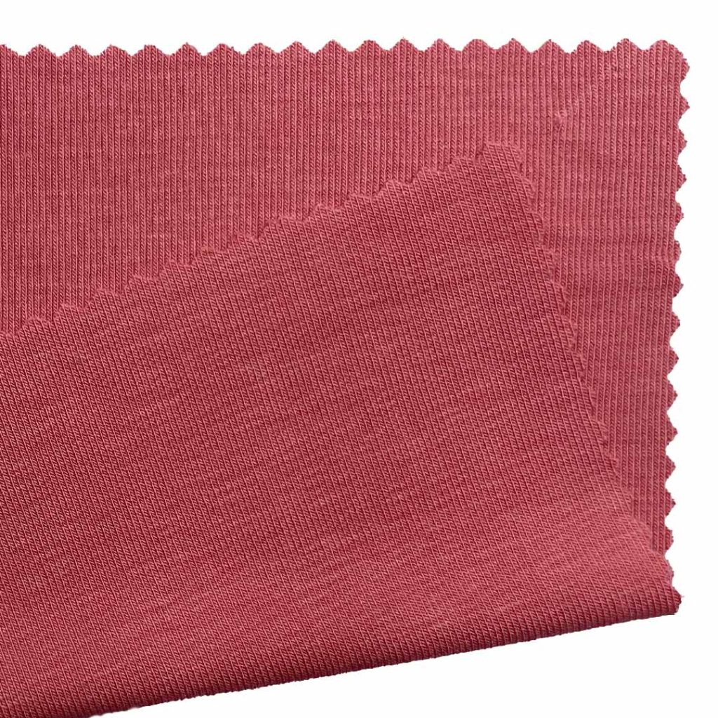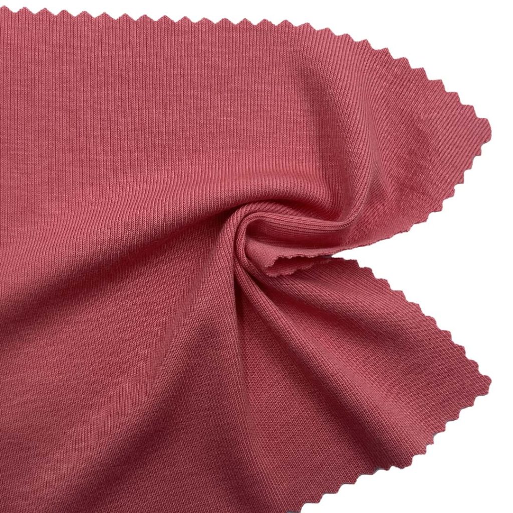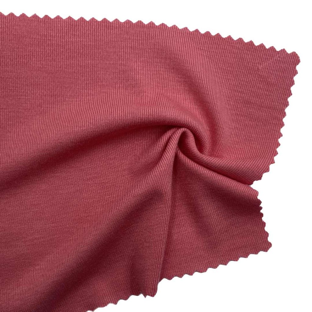 This 200gsm rib fabric combines 65% viscose, 30% polyester and 5% spandex for exceptional softness and comfort. Viscose provides silky touch and breathability, polyester enhances durability and shape retention, while spandex offers perfect elasticity for comfortable fit. The rib structure creates unique vertical texture and moderate stretch. 200gsm weight maintains lightweight characteristic with good drape, ideal for dresses, long sleeve shirts and T-shirts. Smooth surface feels comfortable against skin, with good moisture-wicking properties for all-day wear. Easy care, wrinkle-resistant, maintaining soft texture and vibrant color after repeated washing.