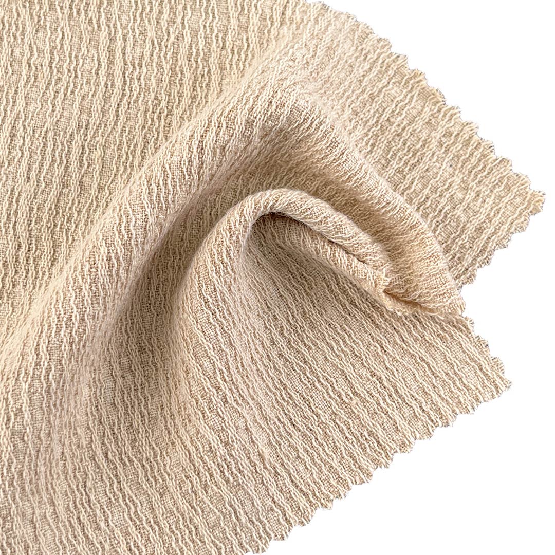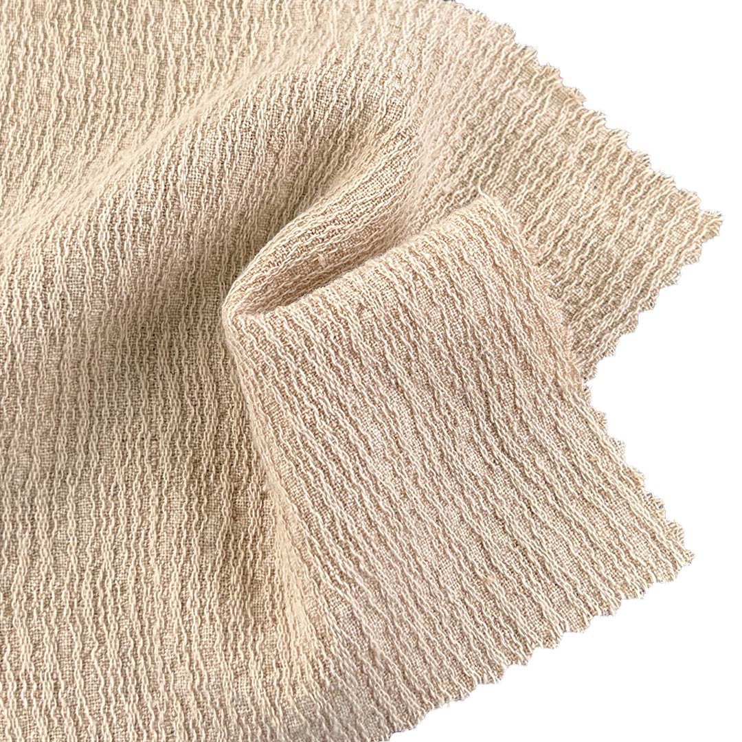 This innovative fabric features intentionally designed crinkled pleats that create a deeply textured hand feel and a visually engaging surface rich with organic irregularity and sculptural dimension. Linen introduces a rustic breathability and natural slub character, while cotton contributes softness and moisture absorption. Rayon enhances the fabric’s drape with a smooth fluidity, and polyester provides essential durability shape retention and resilience within the pleated structure. Weighing 210gsm this medium-weight fabric balances substantial body with graceful movement making it ideal for skirts and dresses that celebrate tactile artistry. The crinkled pleated surface plays with light and shadow creating dynamic visual interest and a sense of crafted imperfection that elevates any design. Designed for those who appreciate textile narrative this fabric maintains its artistic texture through careful wear and gentle care.