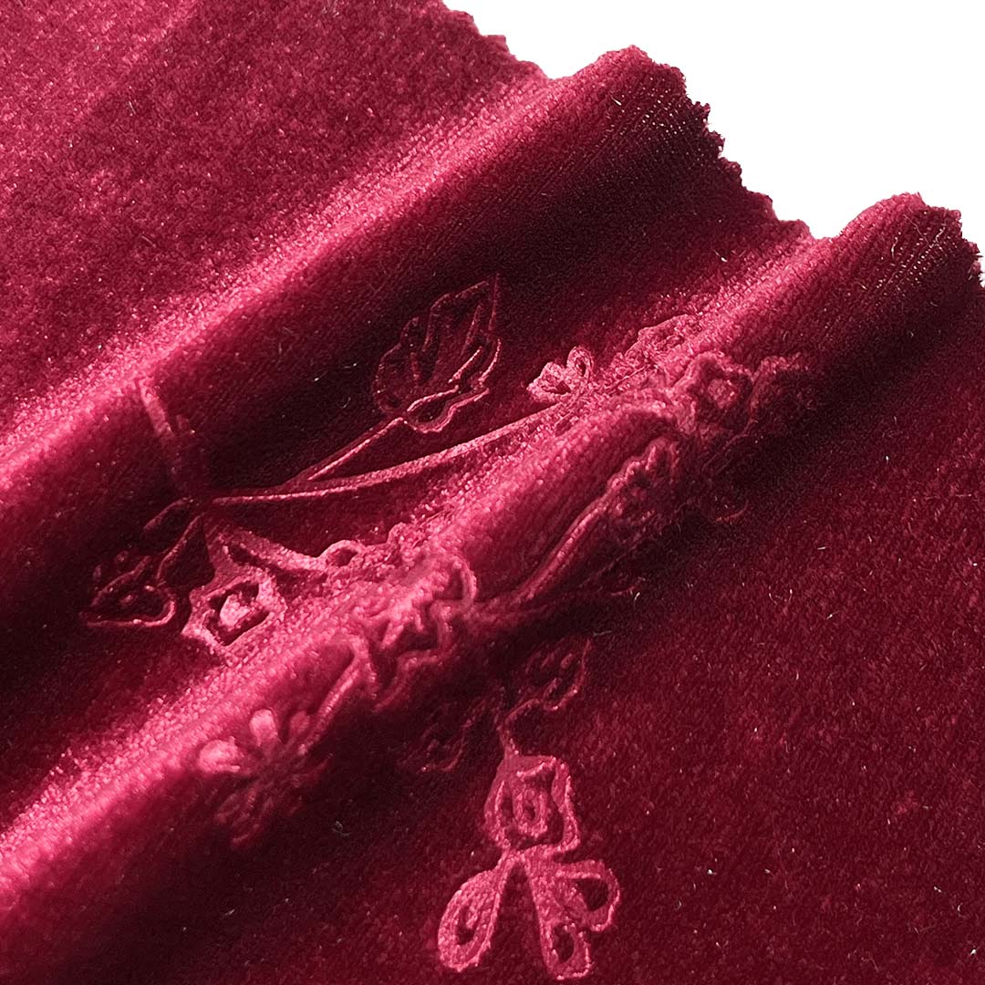 Polyester ensures durability, vibrant color retention, and resistance to crushing, while the 5% Spandex provides gentle stretch for ease of movement and a comfortable fit. Weighing 240gsm, this fabric provides excellent body and drape, making it perfect for structured silhouettes that require both softness and support. The embossed velvet surface catches light beautifully, enhancing the visual depth and richness of any design. Perfect for creating luxury evening dress fabric and bridal costume material, this textured velvet textile adds a touch of drama and sophistication to garments.