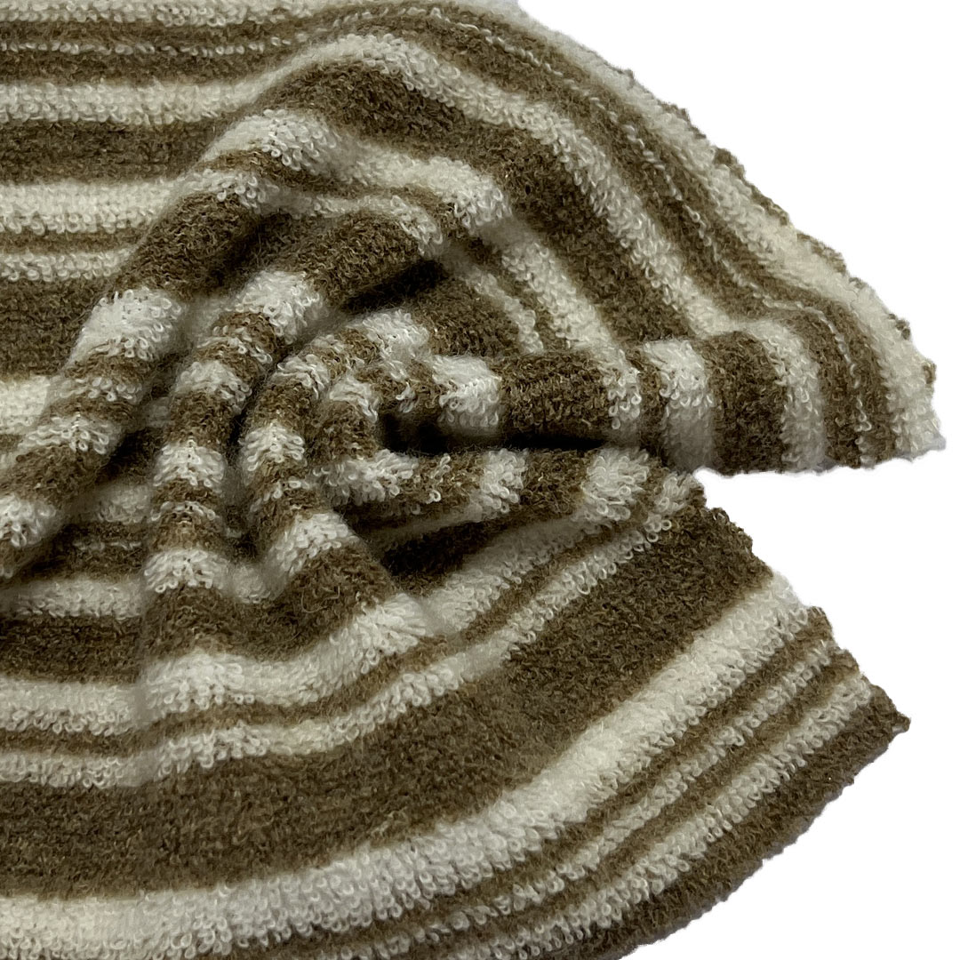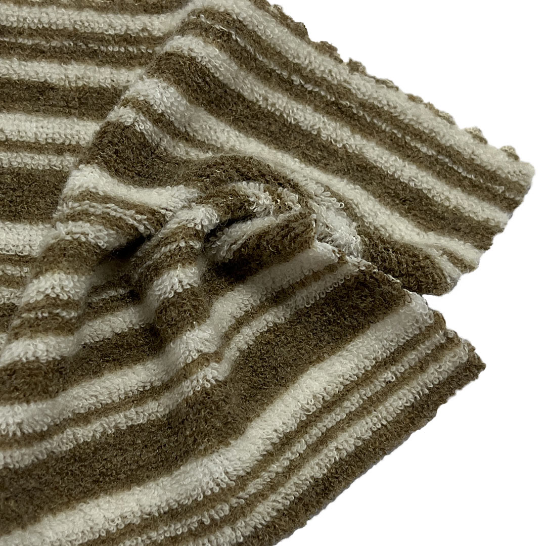 Crafted for ultimate comfort and cozy relaxation, our 270gsm towel fabric blends 4% Silk, 4% Wool, 19% Viscose, and 73% Polyester to create a plush, absorbent material with a luxuriously soft hand feel. This fabric features a classic towel weave with looped piles that enhance its absorbency and provide a gentle, textured surface against the skin. Silk adds a subtle sheen and smooth elegance, Wool contributes natural warmth and a delicate touch, Viscose ensures excellent moisture-wicking properties and breathability, while Polyester offers durability, shape retention, and easy care.