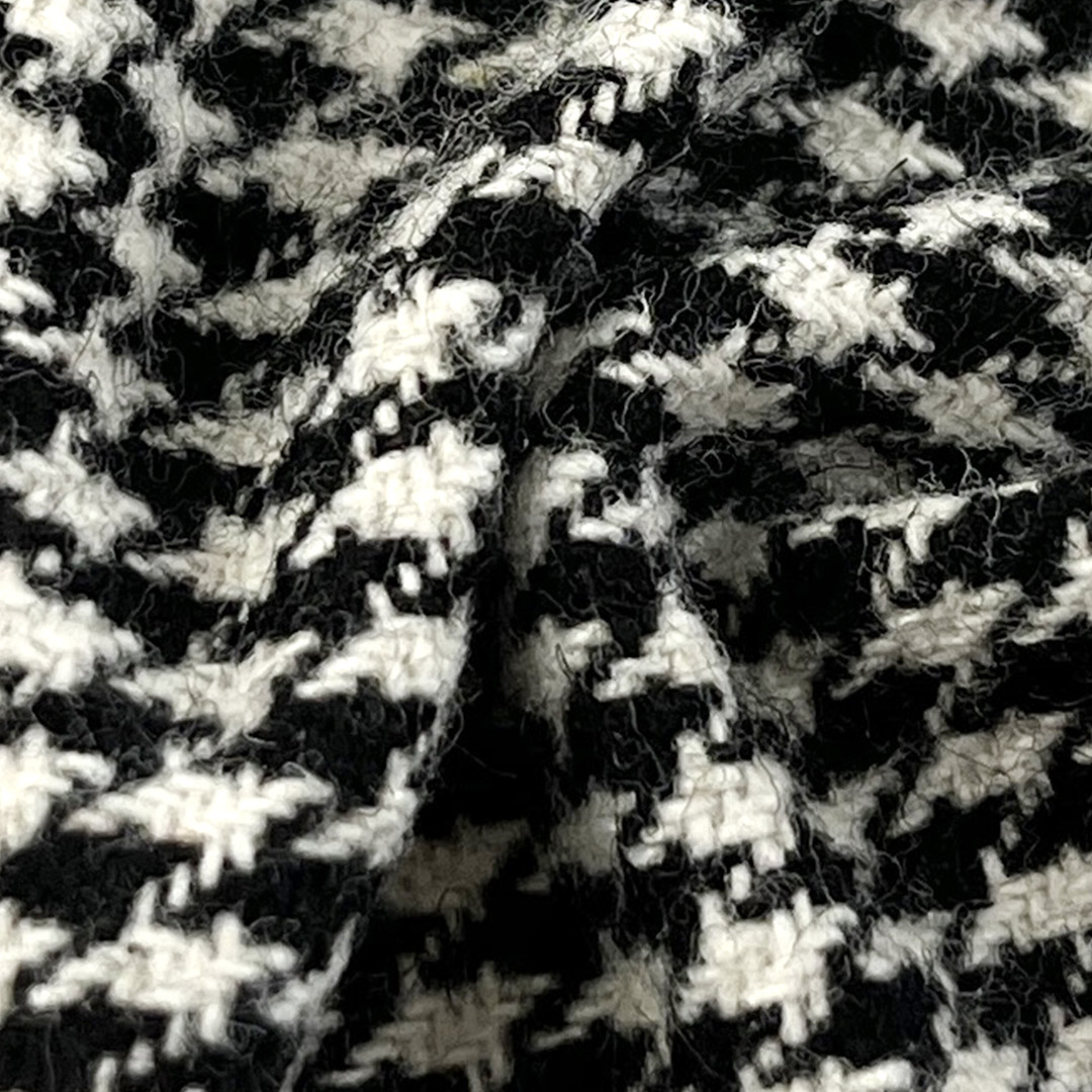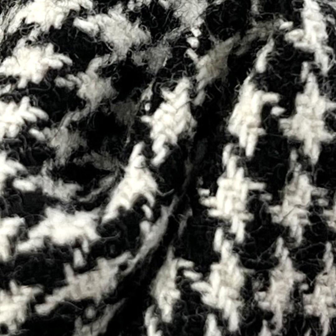 Designed for structural integrity and timeless style, our 350gsm Polyester Tweed Houndstooth Fabric is crafted entirely from 100% polyester to deliver a dense, textured material that excels in structured apparel and premium decor applications. This Textured Tweed Fabric features the classic Houndstooth pattern woven into a sturdy, Shape Retention construction, making it ideal for structured dresses, supportive cushions, tailored blazers, elegant packaging, and statement coats.