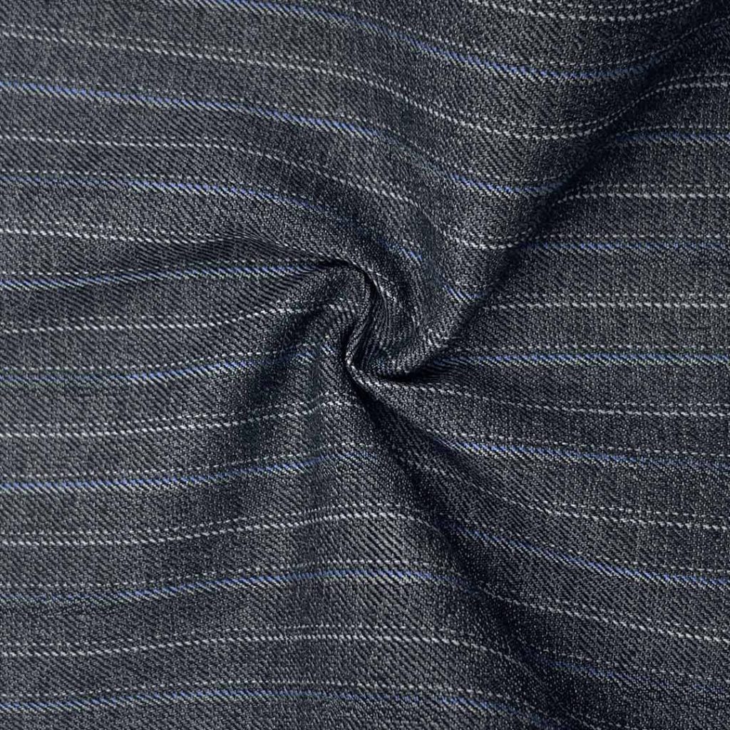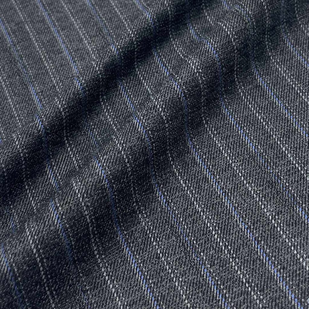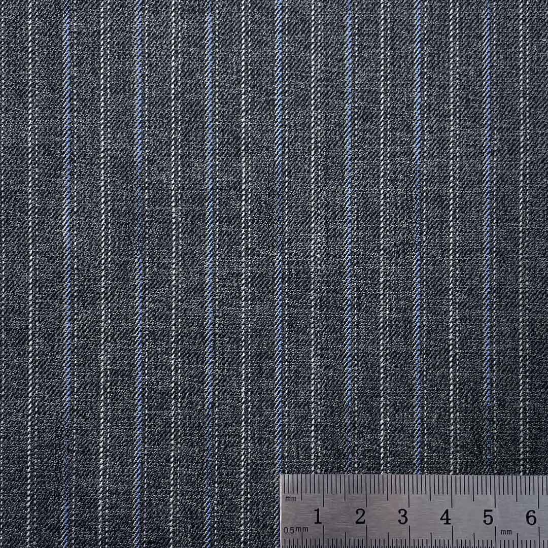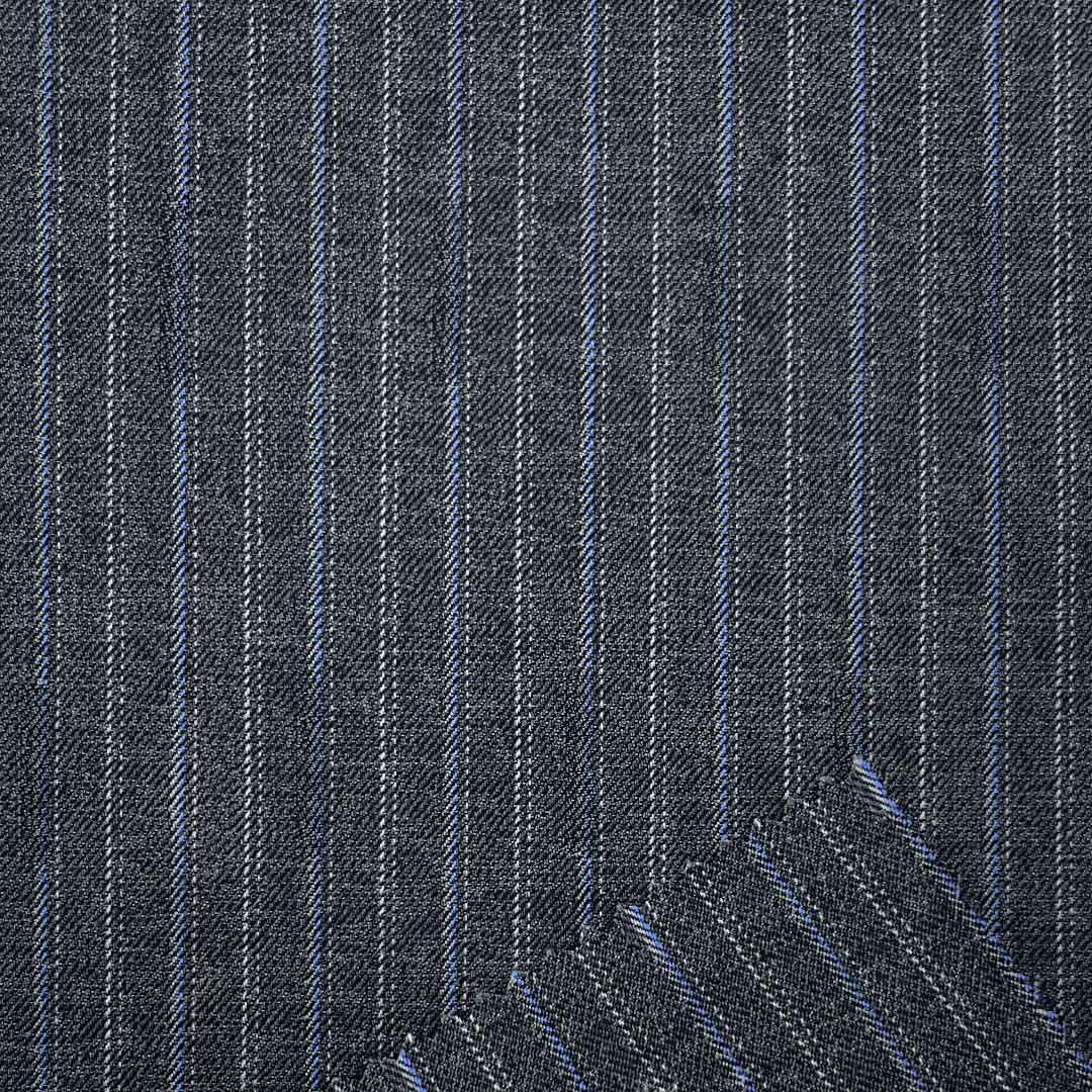 Weighing 390g/m (7.7oz), this technical fabric combines 82% polyester, 15% viscose, and 3% spandex to create a premium suiting material with definitive crisp hand feel and refined texture. The advanced blend achieves perfect balance between structural integrity and visual sophistication through its precise fiber composition.