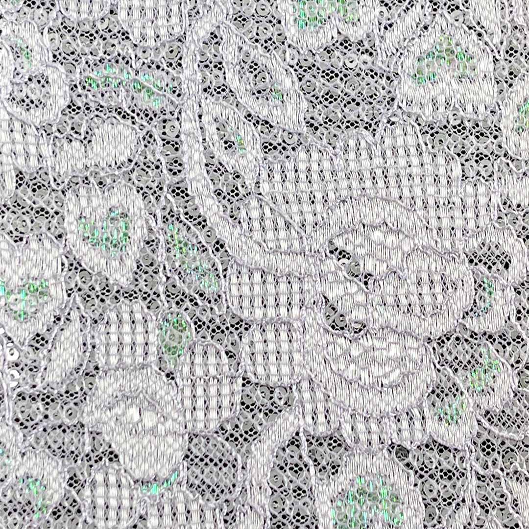 This decorative lace sequin fabric, composed of 60% viscose, 30% polyester, and 10% spandex, offers a unique combination of softness, sparkle, and stretch for glamorous dresses and skirts. The viscose content provides exceptional softness, breathability, and a comfortable drape, creating a pleasant foundation for the embellished surface.