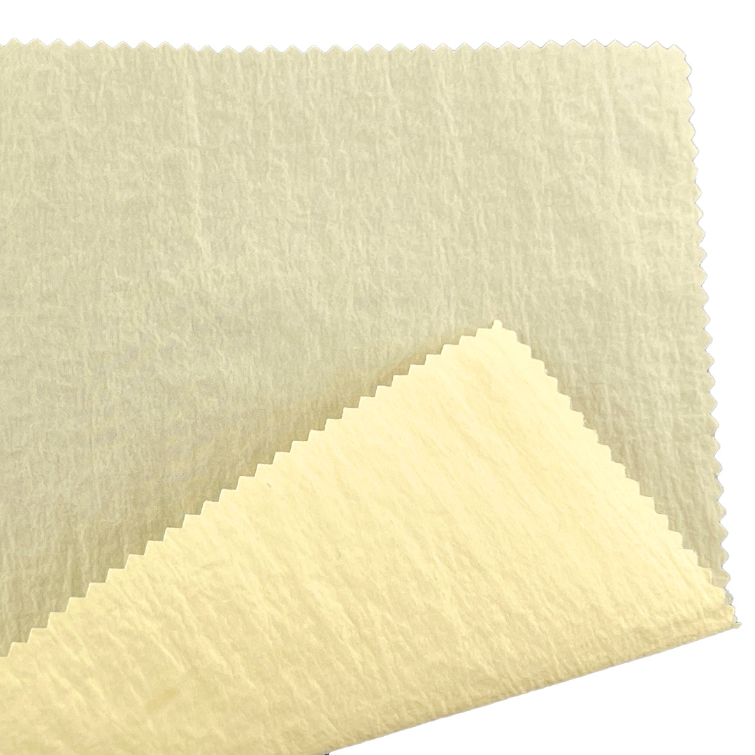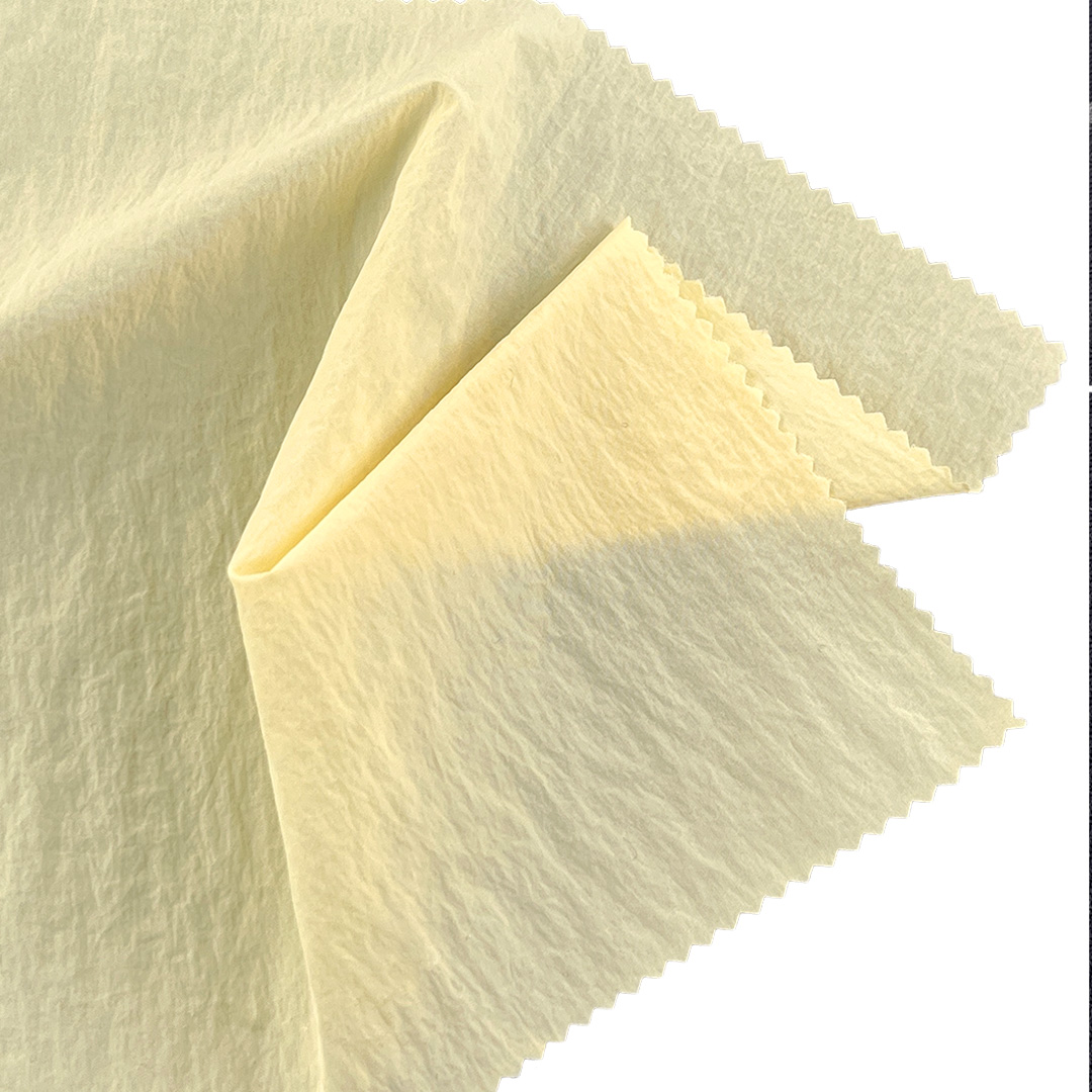 Introducing our lightweight 70gsm dress crinkle fabric, an artistically textured material crafted entirely from 100% Nylon, designed to bring a uniquely wrinkled elegance to dresses and T-shirts. This delicate fabric features intentional permanent crinkles that create a striking dimensional surface, offering both visual depth and a distinctive crinkled hand feel that defines its character. Nylon provides exceptional strength, durability, and a subtle sheen that catches light beautifully, enhancing the fabric's luminous and sophisticated appeal in casual settings.
