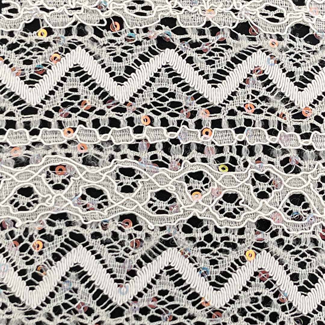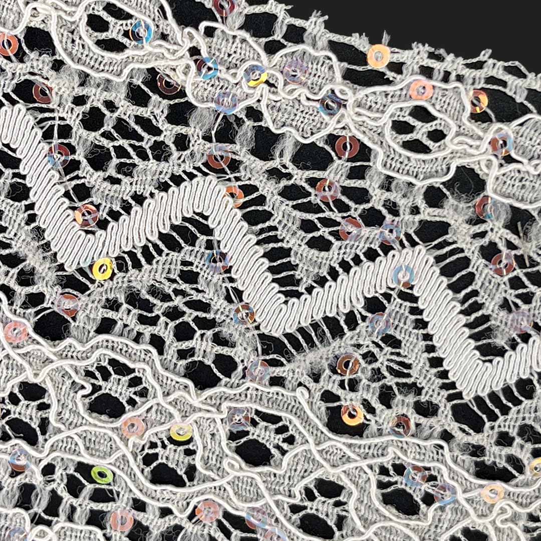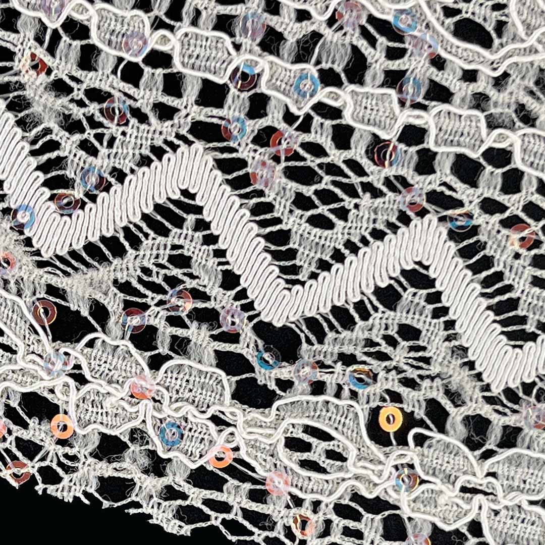 This soft & ltch-free sequin lace textile, composed of 90% polyester and 10% spandex, creates a sparkling and stretchable material specifically designed for evening gowns and bridal dresses. The high polyester content provides a durable, colorfast base that securely holds the sequins while offering excellent shape retention for formal silhouettes.