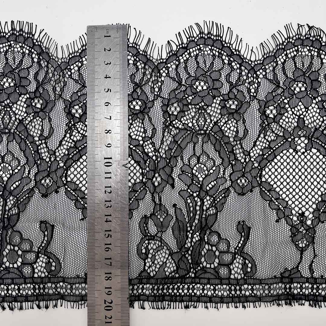 Specially designed as a decorative clothing accessory, this 100% polyamide Chantilly lace offers exquisite intricacy and translucent elegance for fashion embellishments.