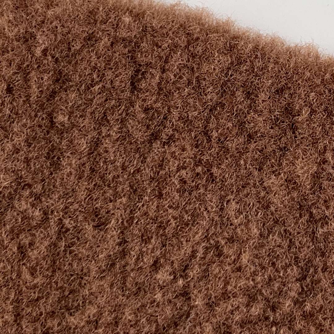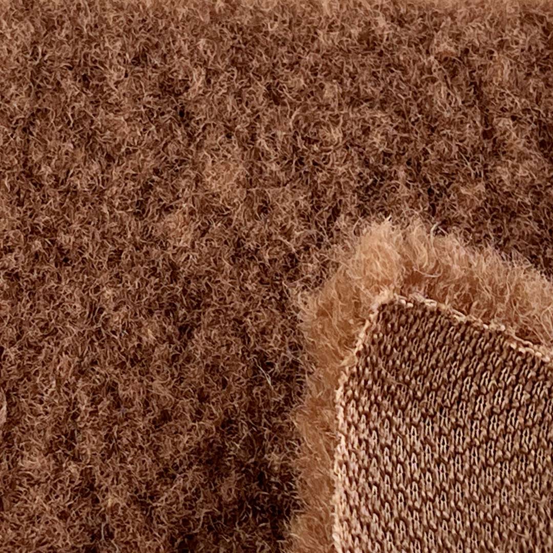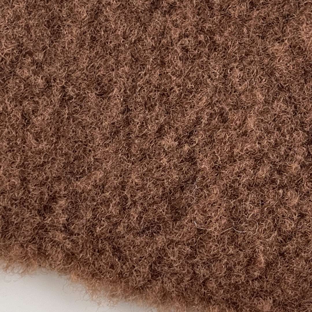 The high-pile fleece interior creates a cloud-like softness, while the textured exterior adds visual interest and a rustic, inviting appeal. Made entirely from durable polyester, this fabric ensures long-lasting performance, resistance to pilling, shrinking, and moisture, and easy maintenance. The soft, brushed surface enhances comfort, while the structured yet flexible build allows for tailored fits in jackets and flowing silhouettes in coats.
